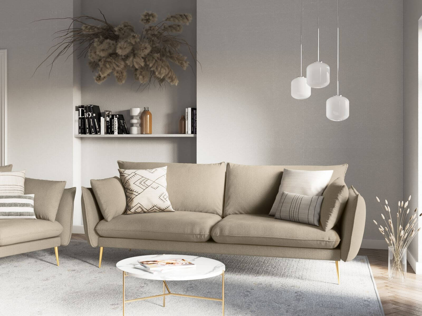 Sofa 3-osobowa Elio strukturalna tkanina ciemny beż nóżki glamour
