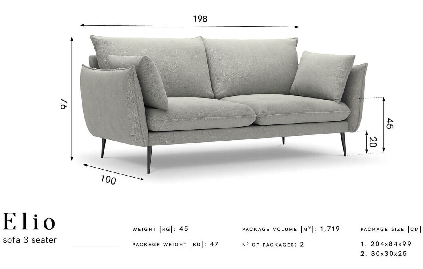 Trzyosobowa sofa Elio to mebel reprezentujący klasę i wysoki komfort wypoczynku. Oprócz cech użytkowych przejawia także walory estetyczne, za sprawą których Twoje wnętrze nabierze przytulnej elegancji.