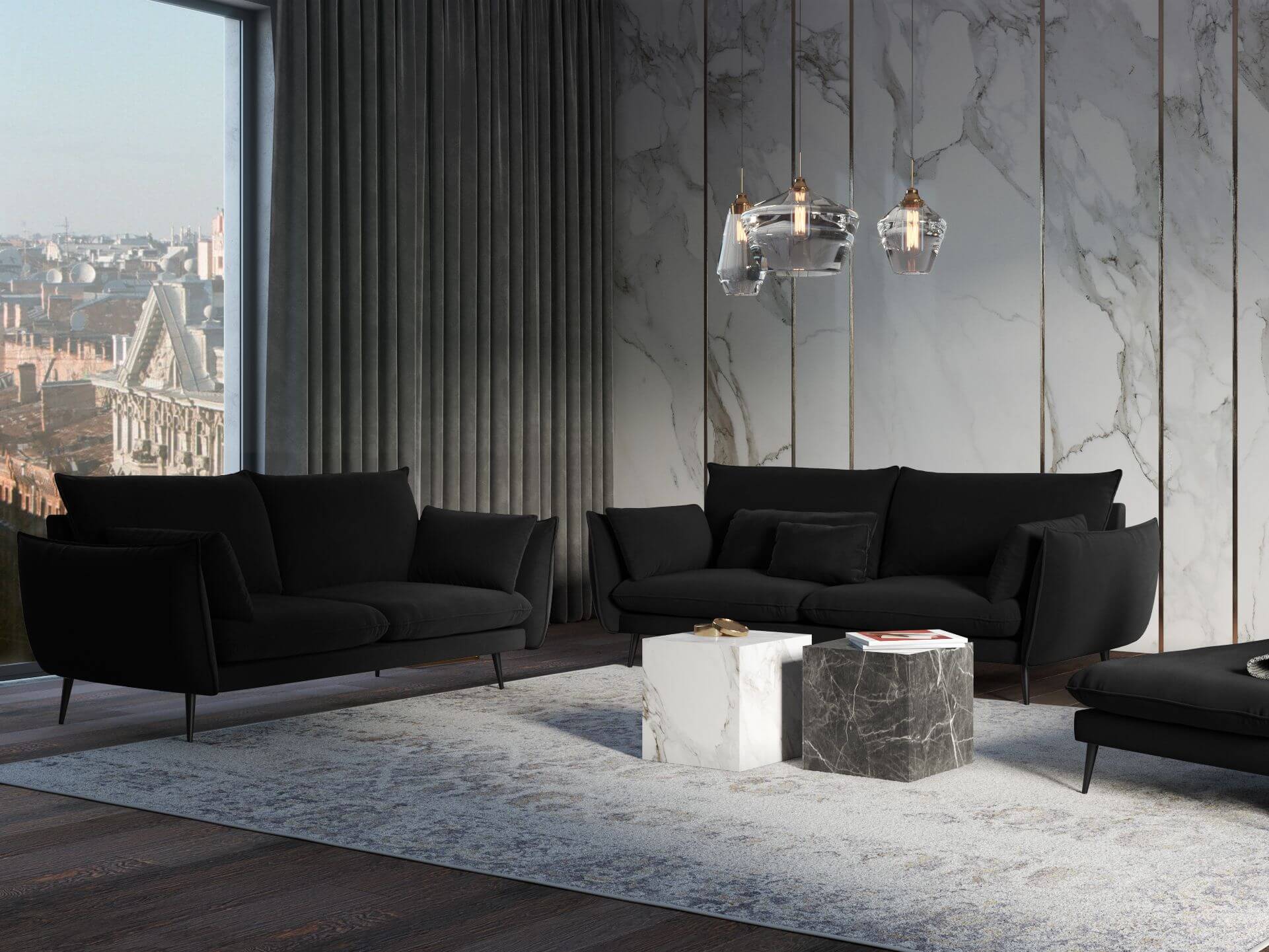 Prezentowana sofa Elio ma czarne nóżki i jest tapicerowana czarną tkaniną Riviera 100. Sofę oferujemy także na złotych nóżkach oraz w kolorach: beżowy (Riviera 21), szary (Riviera 91), butelkowa zieleń (Rivera 38), atramentowy (Riviera 81).