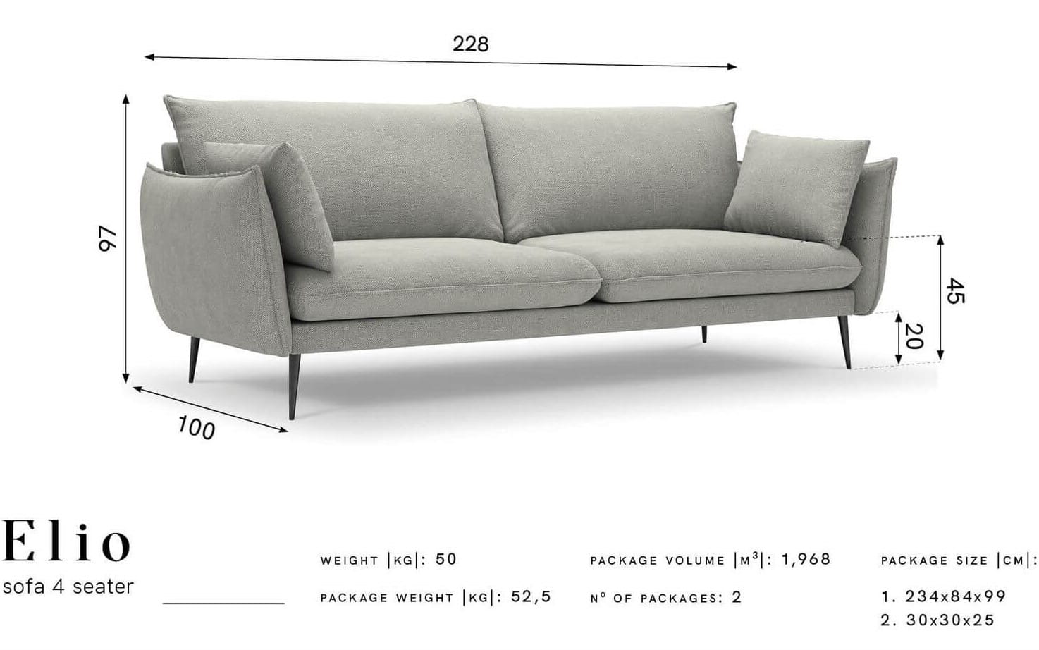 Czteroosobowa, obszerna sofa Elio to mebel reprezentujący klasę i wysoki komfort wypoczynku. Oprócz cech użytkowych przejawia także walory estetyczne, za sprawą których Twoje wnętrze nabierze przytulnej elegancji.