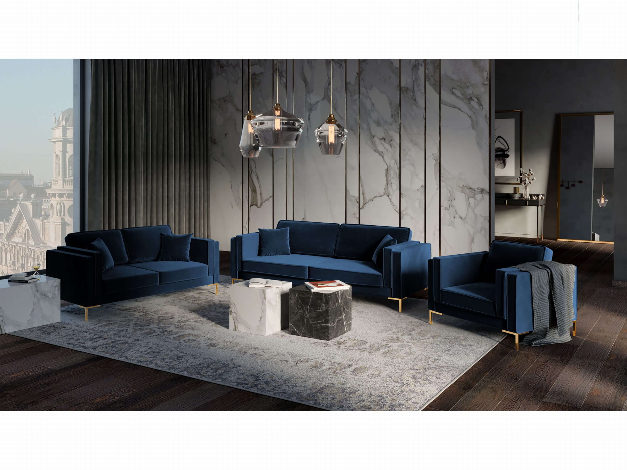 Kolekcja mebli LUIS to propozycja dla osób, które cenią nowoczesność połączoną z klasyką. Prezentujemy wygodną, ciemno niebieską sofę przeznaczoną dla czterech osób, która emanuje stylowym minimalizmem form.