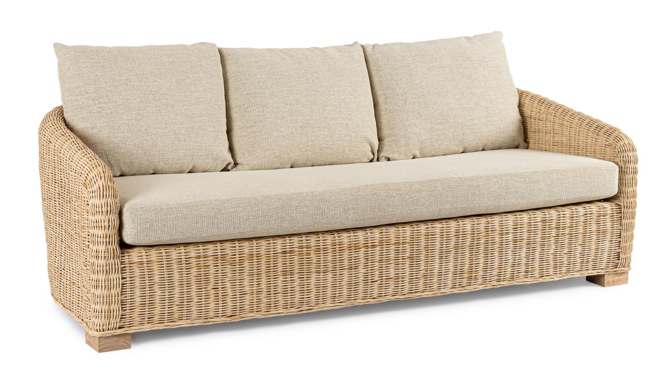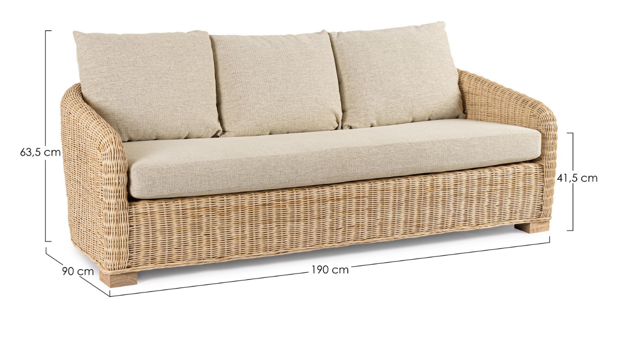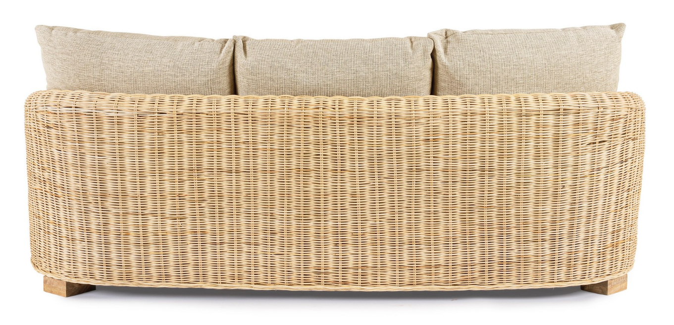 Solidną podstawę mebla stanowią niskie, wytrzymałe nogi z egzotycznego drewna mango. O komfort użytkowników dbają obszerne, miękkie poduchy, które wyścielają oparcie i siedzisko. Ich jasne, tekstylne wykończenie pięknie kontrastuje z miodowym odcieniem plecionki. Co ważne, poliestrowe poszewki są w pełni zdejmowalne, co czyni ten luksusowy mebel również praktycznym w codziennym użytkowaniu.