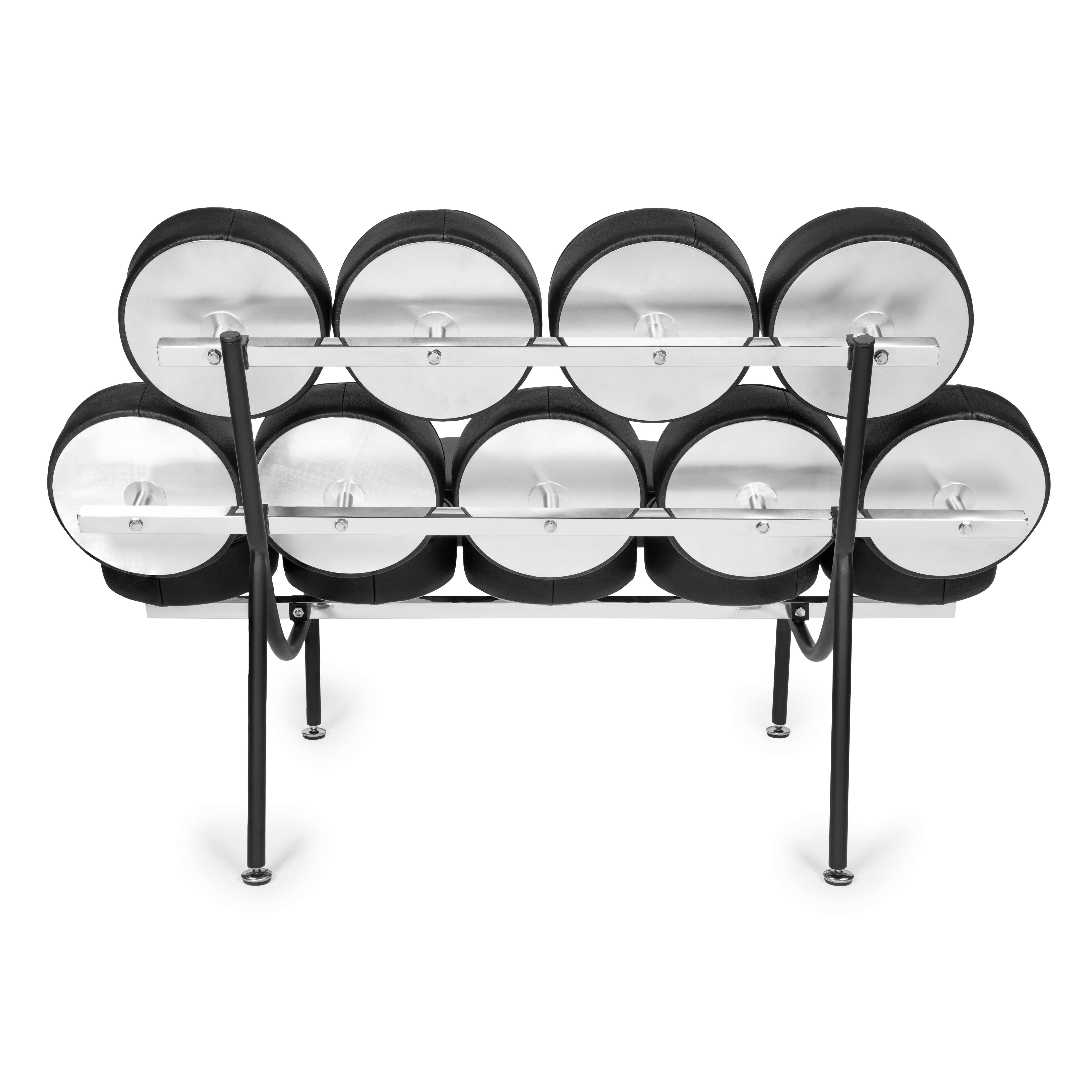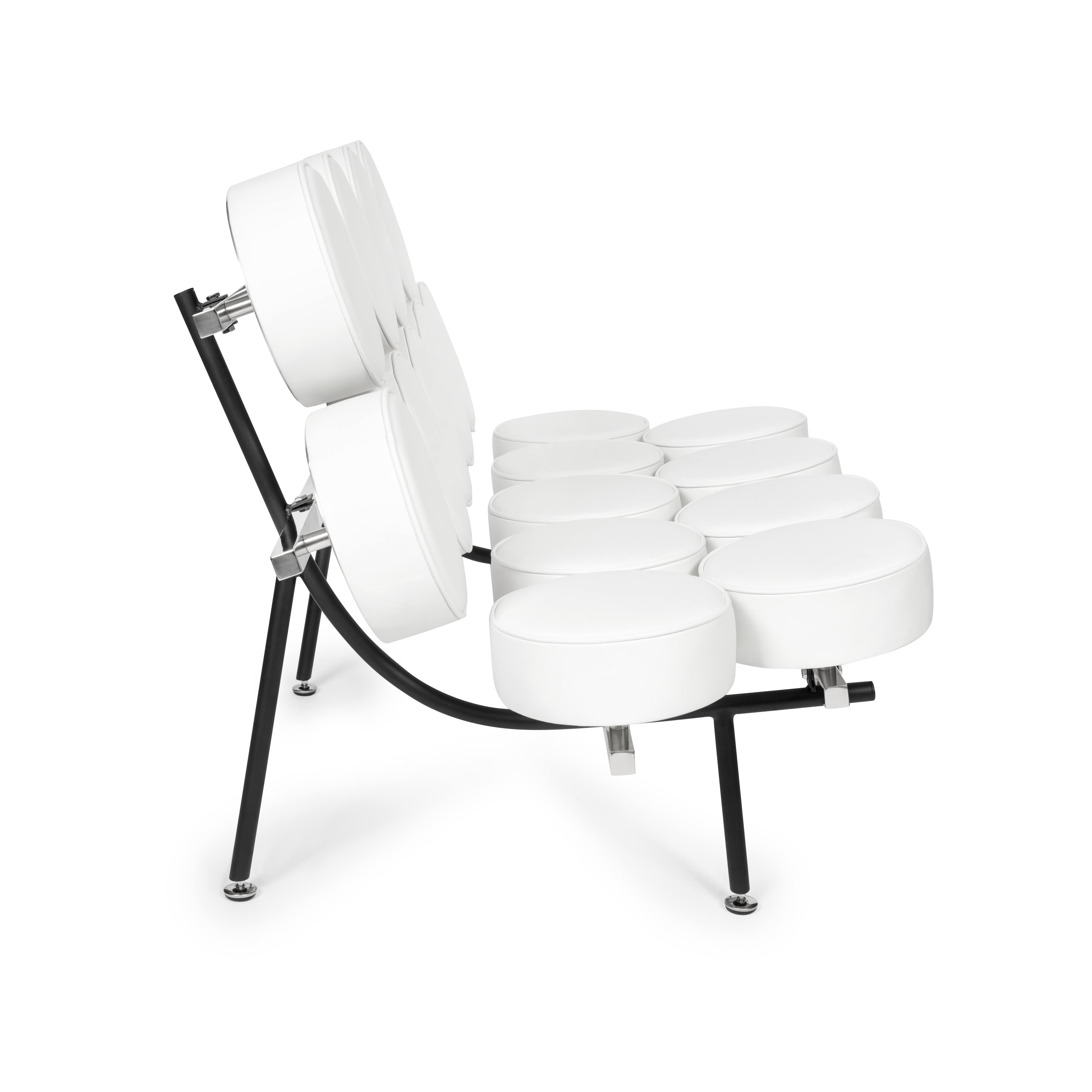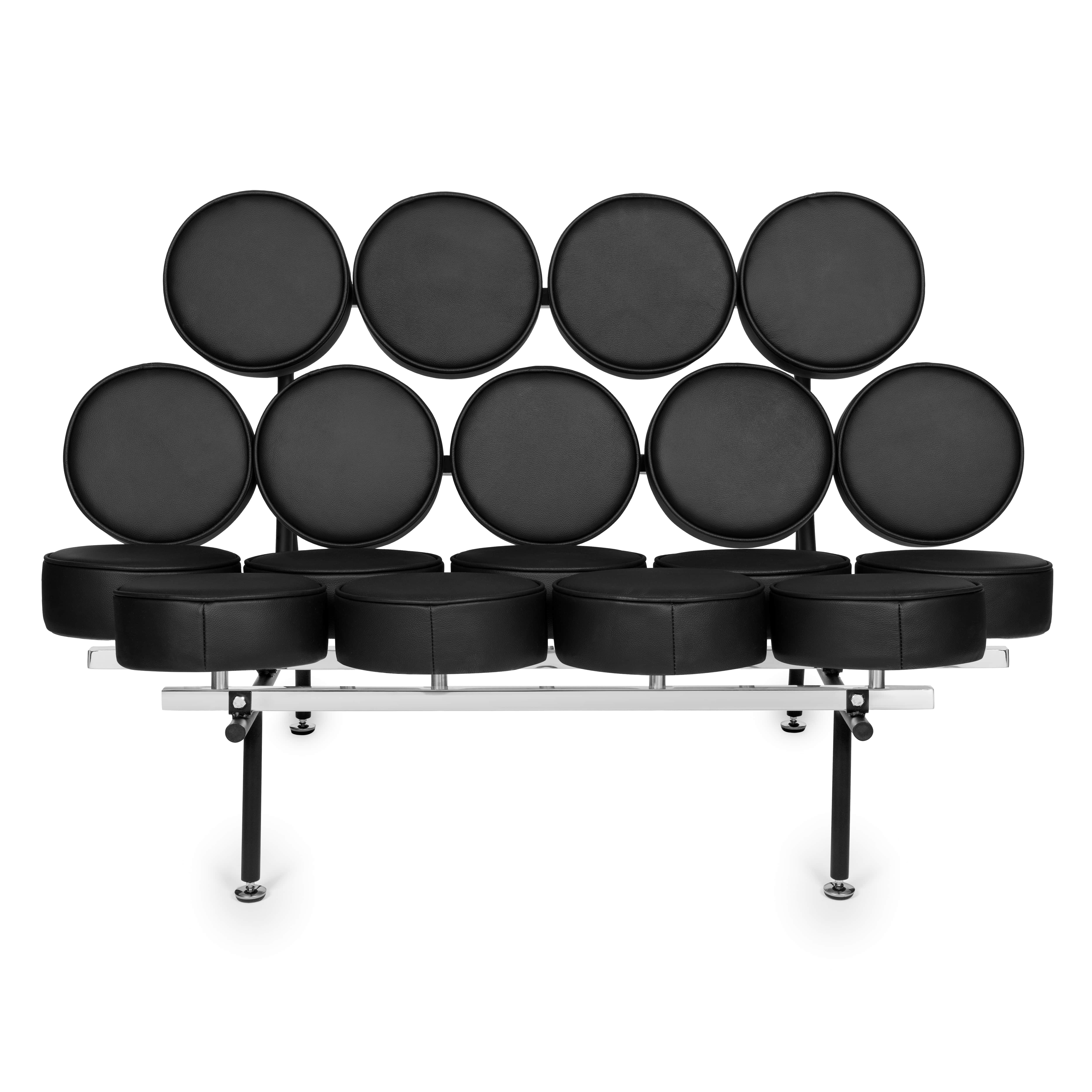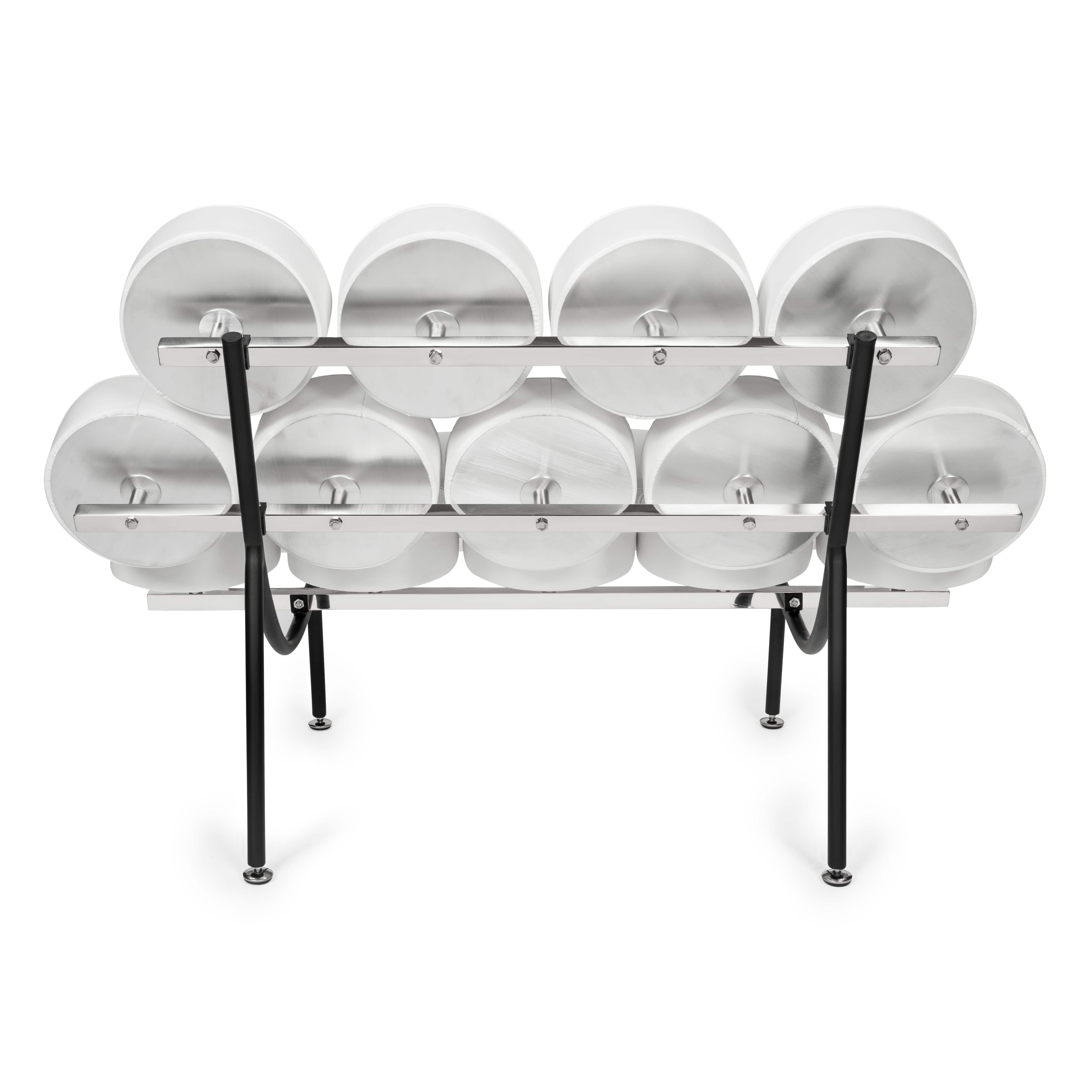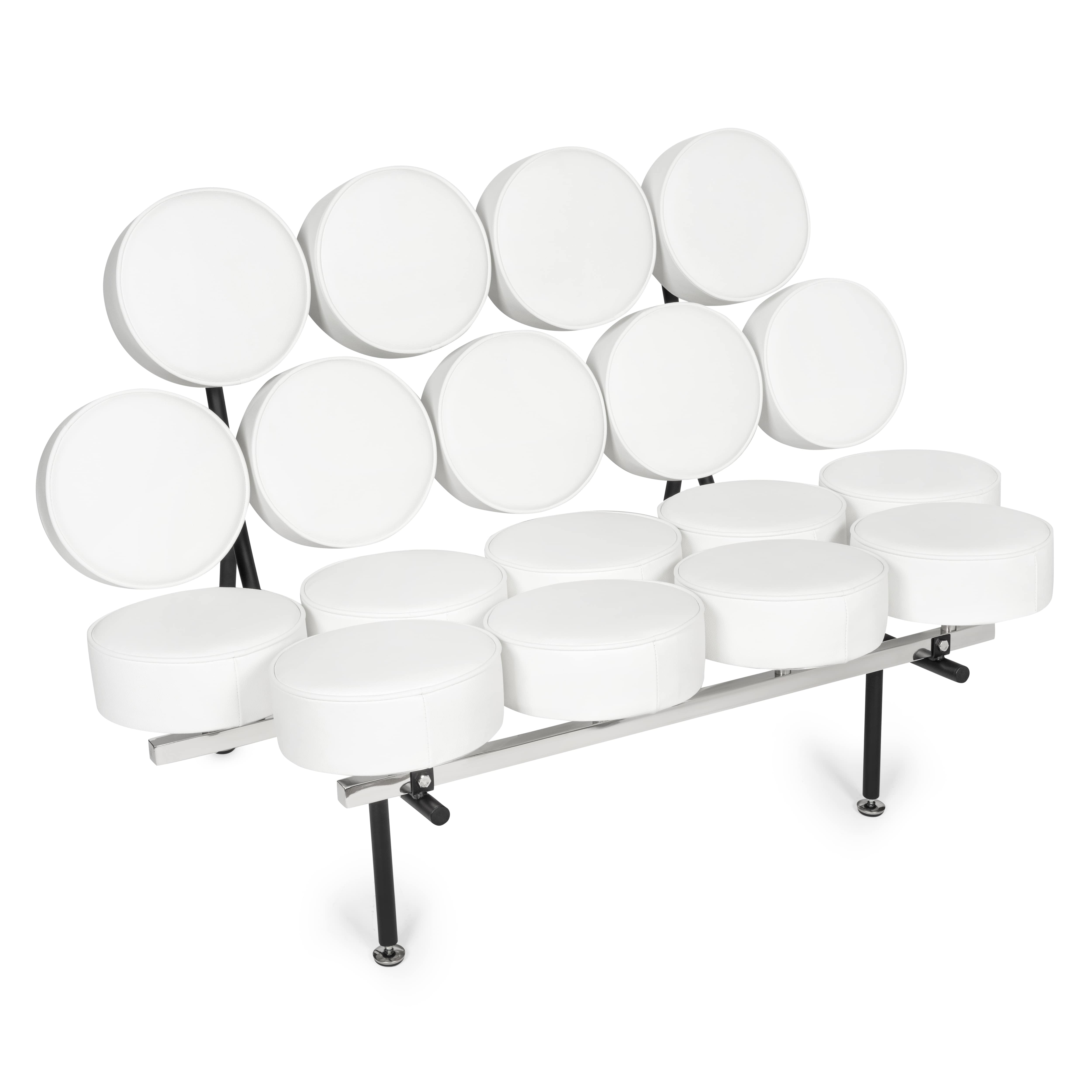 Sofa Candy zbudowana jest z metalowej ramy, na której w regularnych odstępach umieszczone zostały okrągłe poduszki. Poduszki układają się w zabawny wzór, który nieco przypomina krystaliczną sieć, tworząc unikalny efekt wizualny.