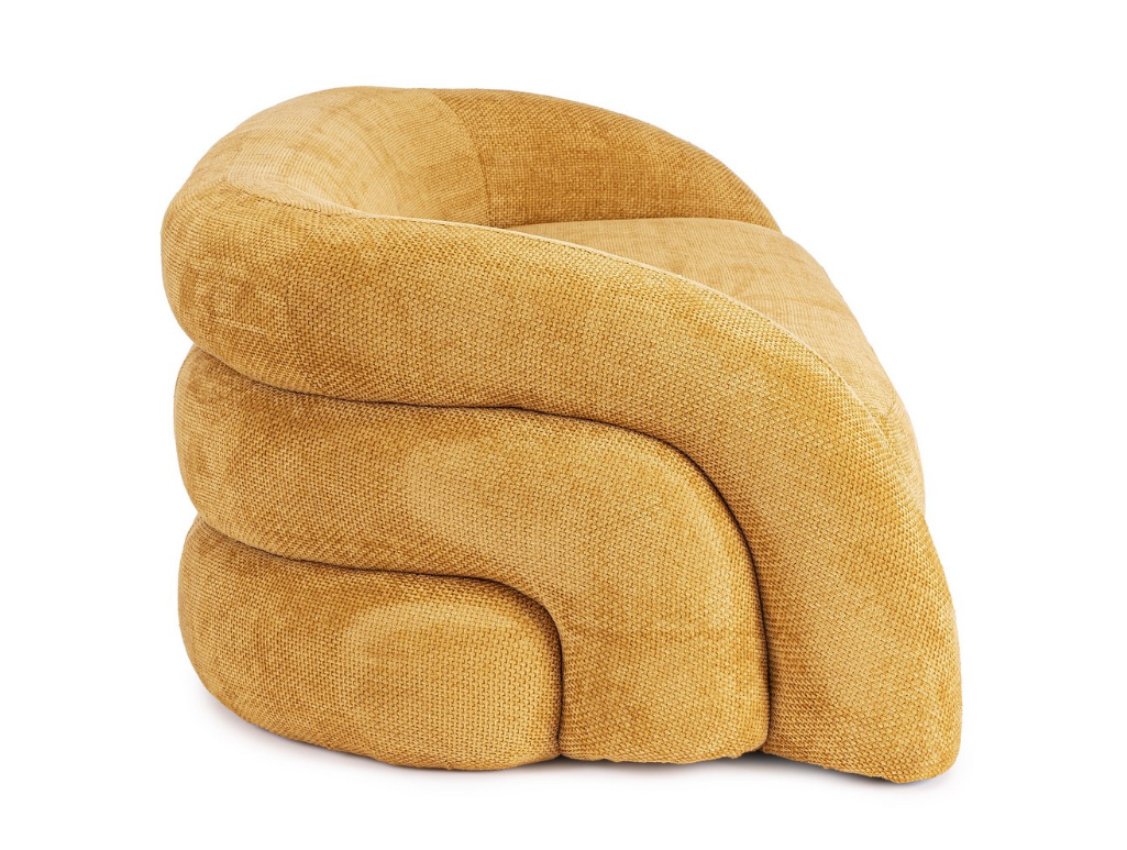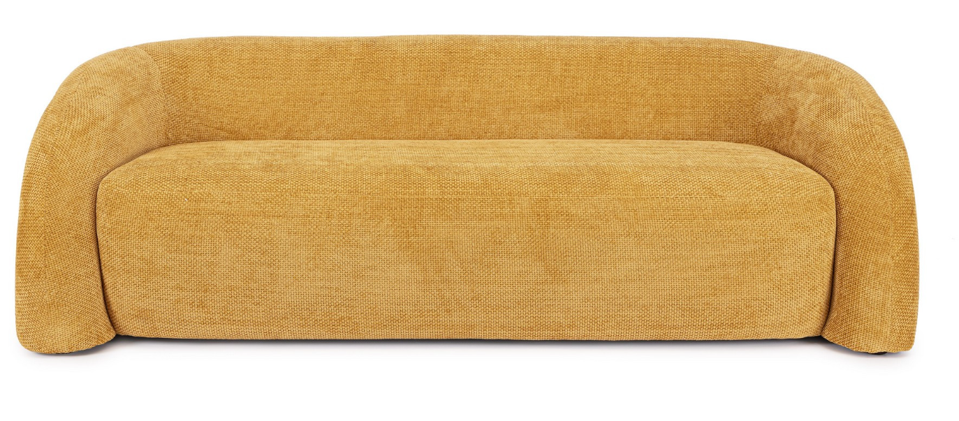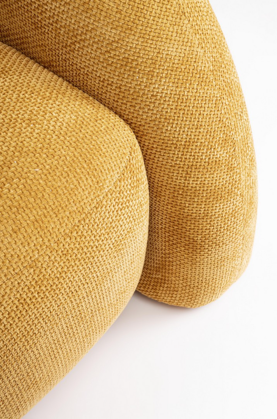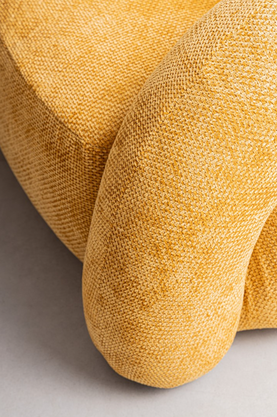 Największym atutem tego modelu jest tapicerka w nasyconym, musztardowym kolorze. Zastosowany materiał poliestrowy charakteryzuje się wyrazistą fakturą, która w połączeniu ze złotym odcieniem pięknie odbija światło, nadając meblowi ciepła i trójwymiarowości. To tekstylne wykończenie czyni z sofy Clemence "statement piece" – główny punkt aranżacji, który doskonale komponuje się z betonem, drewnem czy ciemną zielenią roślin.