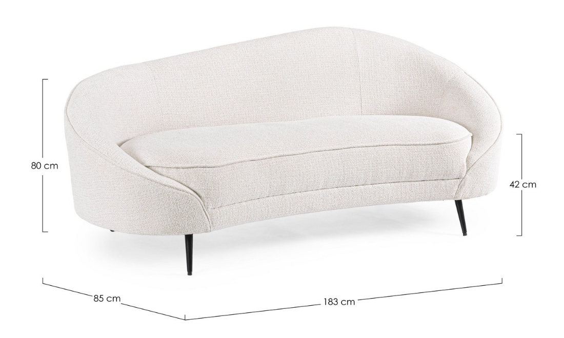 Trzyosobowa sofa Costance to mebel, który przyciąga wzrok swoją niebanalną, rzeźbiarską formą. Jej design wpisuje się w najnowsze trendy, łącząc elegancję stylu Glam z modnym, organicznym minimalizmem. Charakterystyczny, zaokrąglony kształt bryły (przypominający nerkę lub ziarno fasoli) oraz asymetryczne oparcie sprawiają, że sofa prezentuje się niezwykle lekko i płynnie, przełamując surową geometrię tradycyjnych wnętrz.