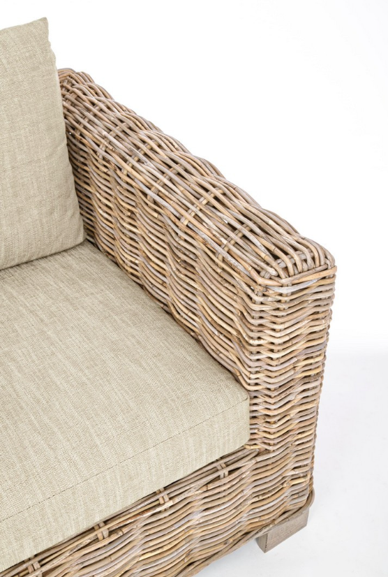 Dwuosobowa wersja sofy Fortaleza to mebel, który udowadnia, że majestatyczny styl może iść w parze z kompaktową formą. Przy szerokości 162 cm sofa ta doskonale odnajdzie się w mniejszych salonach lub jako uzupełnienie większego zestawu wypoczynkowego. Jej korpus został ręcznie wypleciony z grubego, naturalnego rattanu typu Kubu, który charakteryzuje się wyjątkową wytrzymałością i piękną, niejednolitą barwą w odcieniach szarości i beżu. Ta surowa, organiczna faktura wprowadza do wnętrza spokój i bliskość natury.