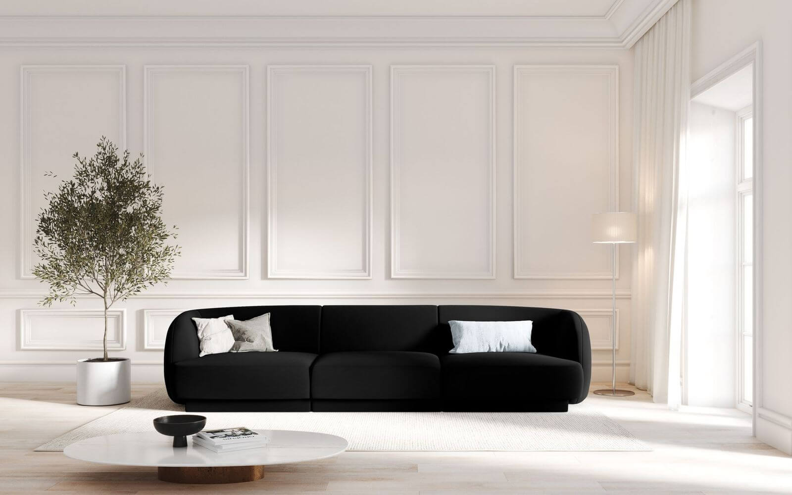 3-osobowa, czarna sofa o zaokrąglonych kształtach, idealnie wpasuje się w nowoczesne trendy wnętrzarskie.