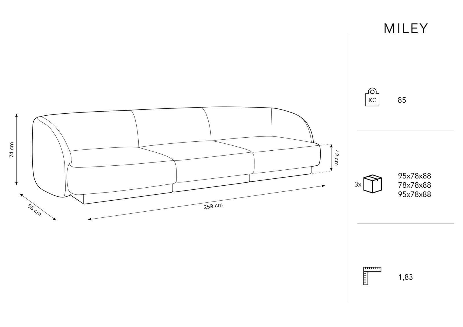 Trzyosobowa sofa Miley wypełniona jest watoliną 100 g/m² oraz pianką poliuretanową (siedzisko 30 kg/m³, oparcie 25 kg/m³).