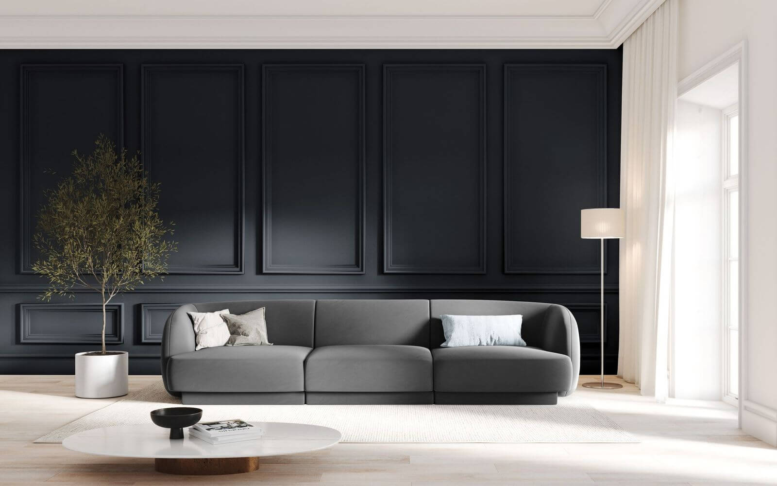 3-osobowa sofa tapicerowana jest syntetyczną, szarą tkaniną imitującą aksamit - Bluvel 14. Delikatny połysk materiału sprawia, że jest on dobrym wyborem do eleganckich projektów wnętrz.