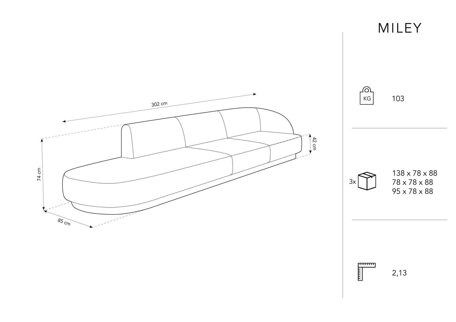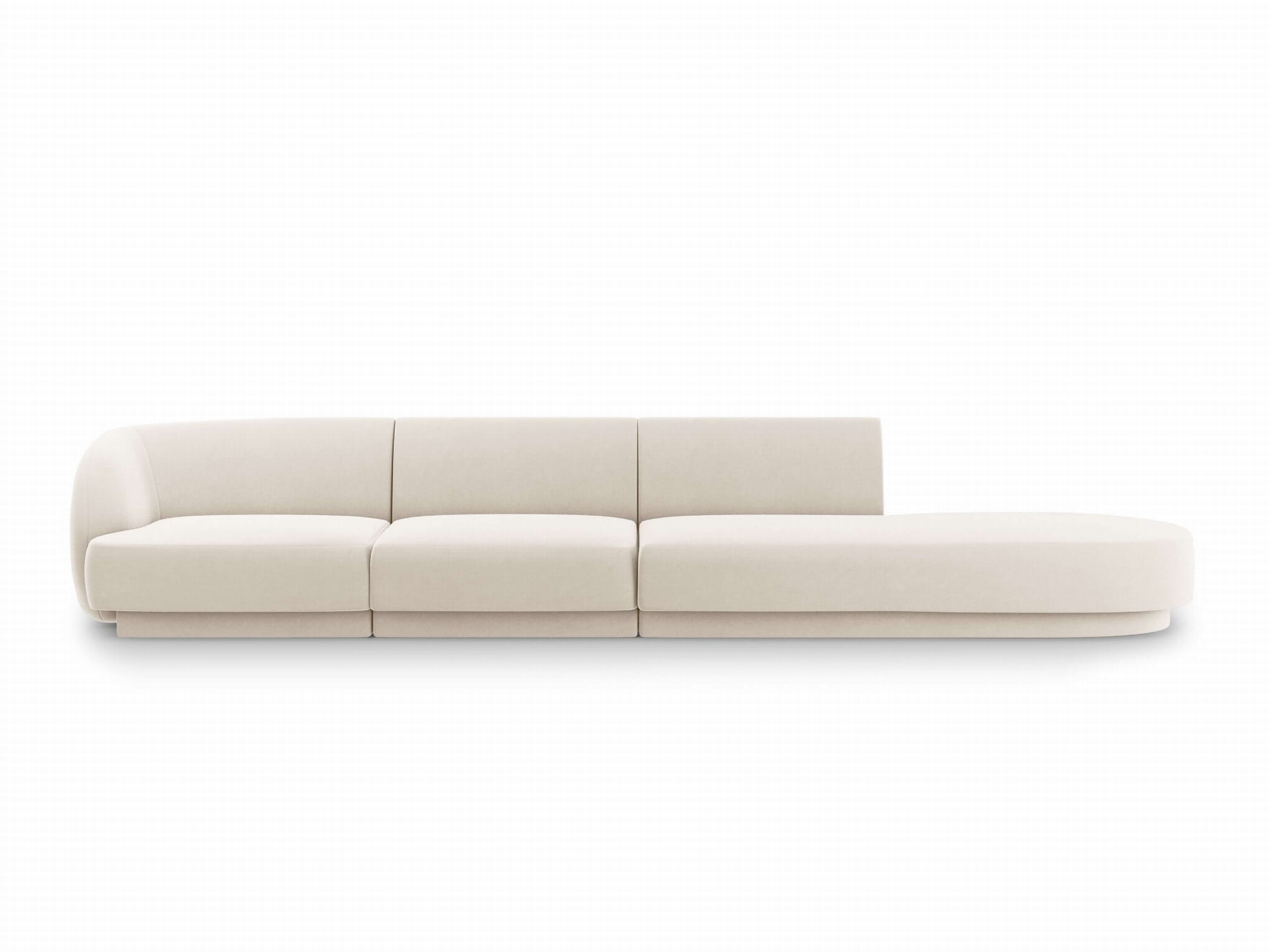 Duża, jasna sofa Miley tapicerowana jest syntetyczną tkaniną imitującą aksamit - Bluvel 22. Delikatny połysk materiału sprawia, że jest on dobrym wyborem do eleganckich projektów wnętrz.