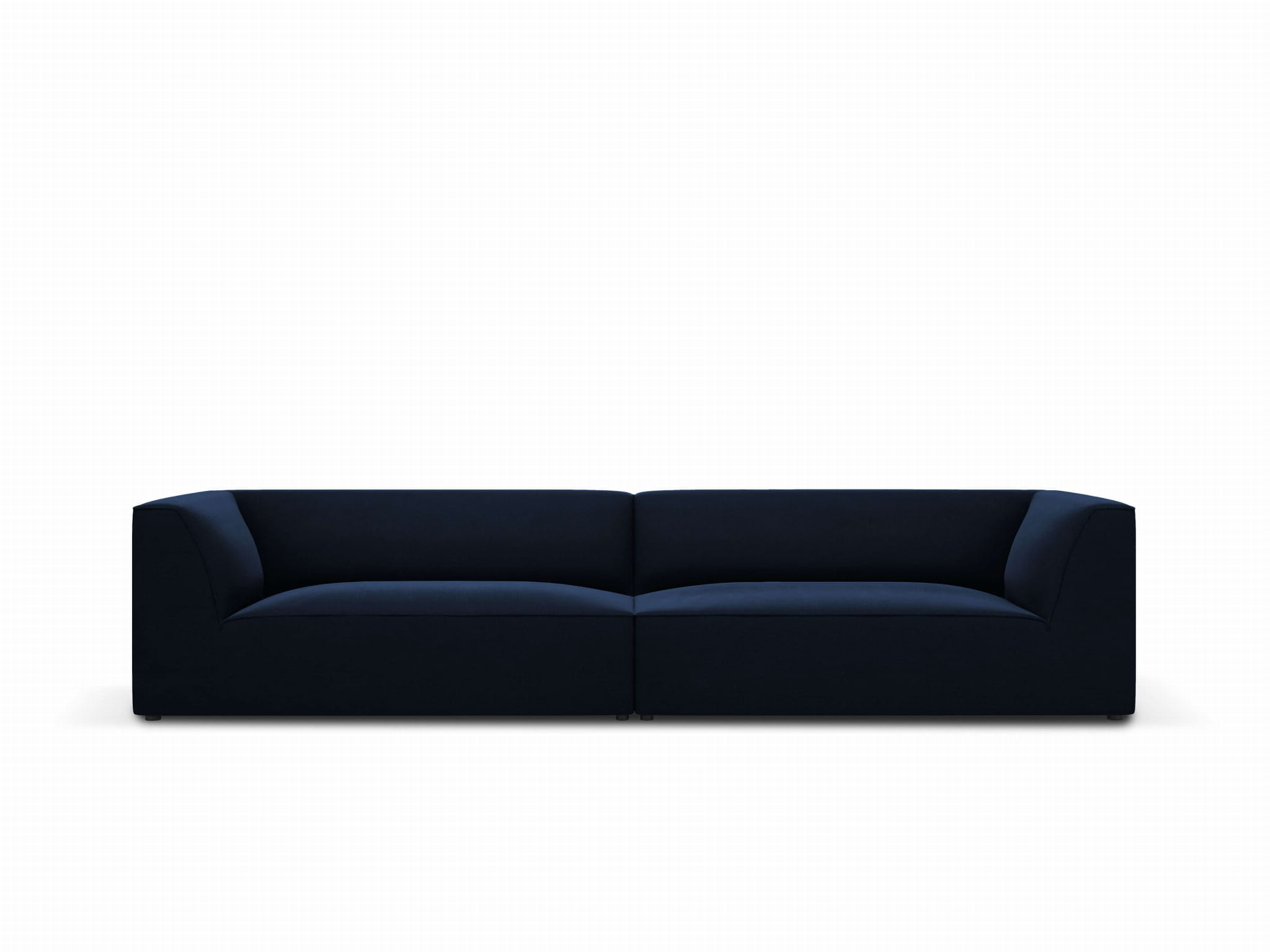4-osobowa, granatowa sofa ustawiona jest na niskich, 3-centymetrowych czarnych nóżkach, dzięki którym bryła mebla zdaje się unosić nad powierzchnią.