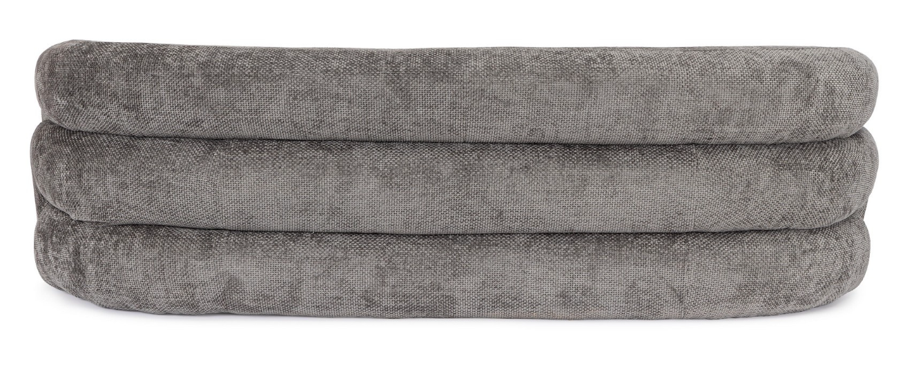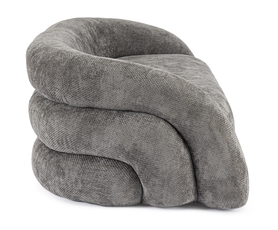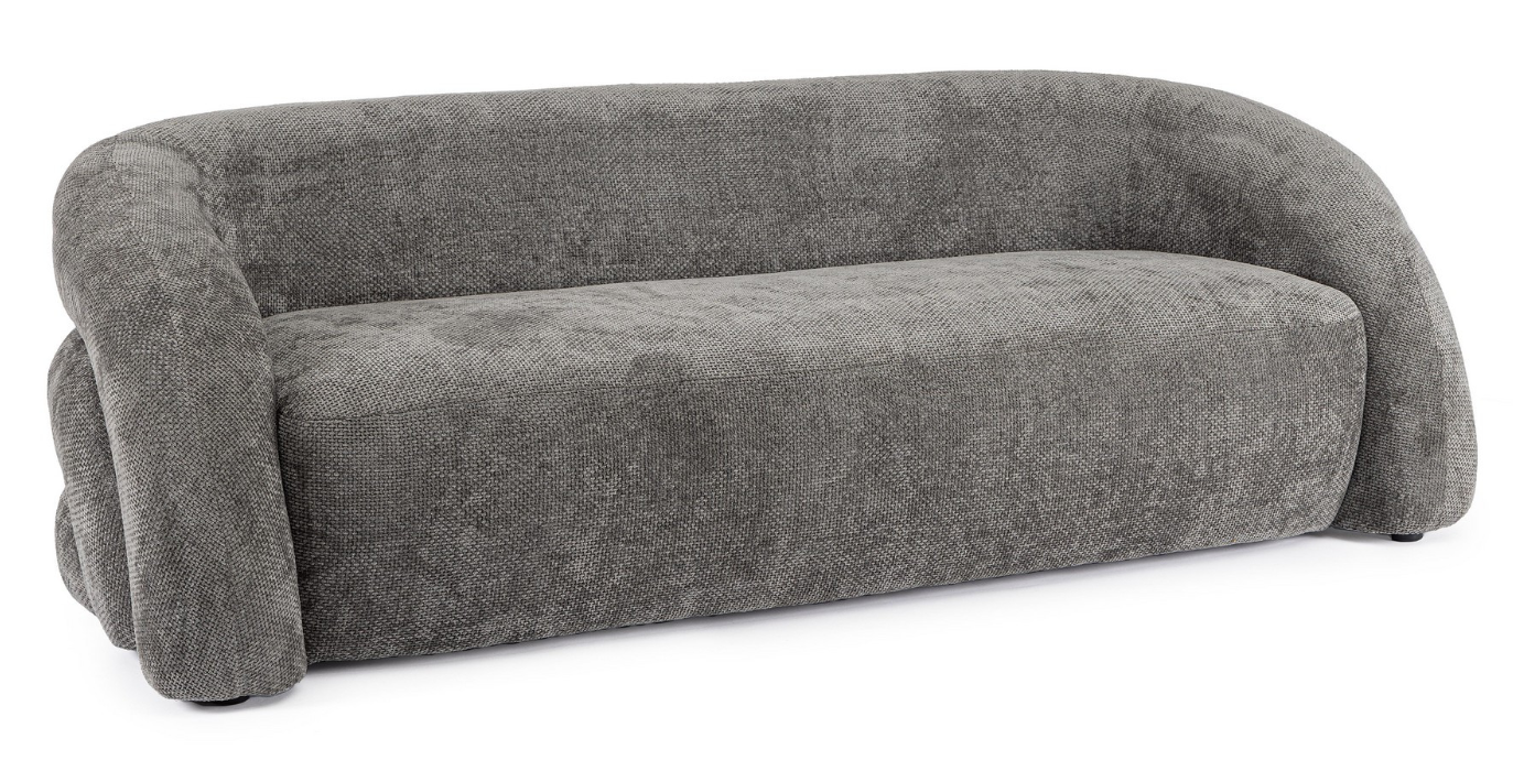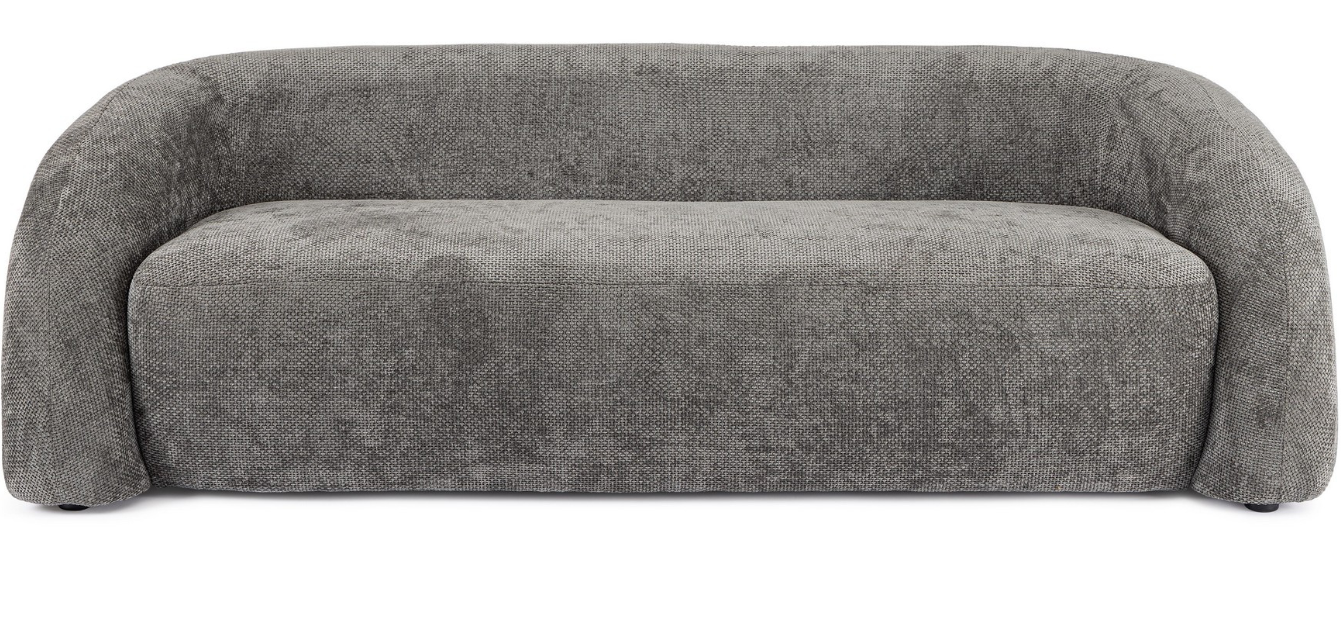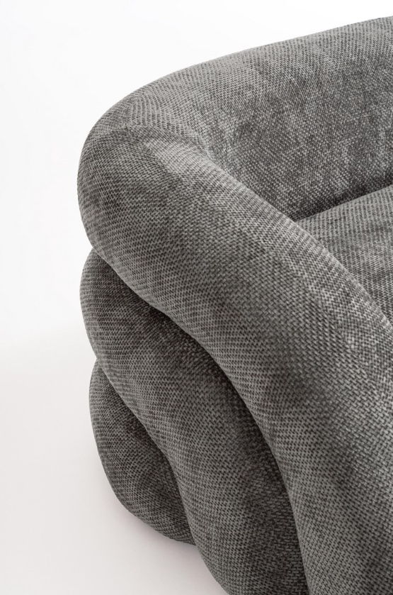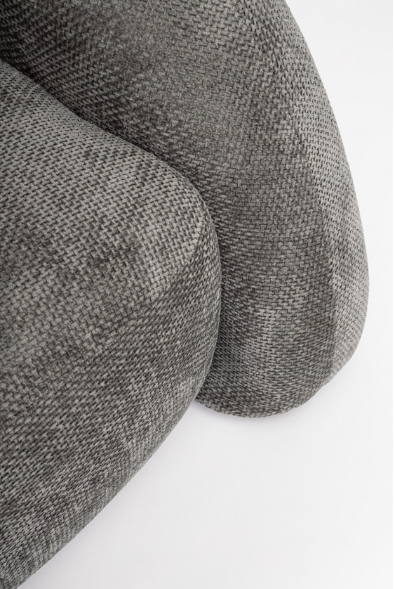 Elegancję projektu podkreśla wykończenie w odcieniu głębokiej, ciemnej szarości. Zastosowana tkanina poliestrowa posiada subtelną, melanżową strukturę, która pięknie pracuje ze światłem, wydobywając trójwymiarowość obłych kształtów mebla. To ciemne, tekstylne obicie jest nie tylko efektowne, ale i praktyczne w codziennym użytkowaniu. Sofa Clemence to mebel-rzeźba, który doskonale odnajdzie się w przestronnych loftach, apartamentach minimalistycznych oraz wnętrzach w stylu lat 70.