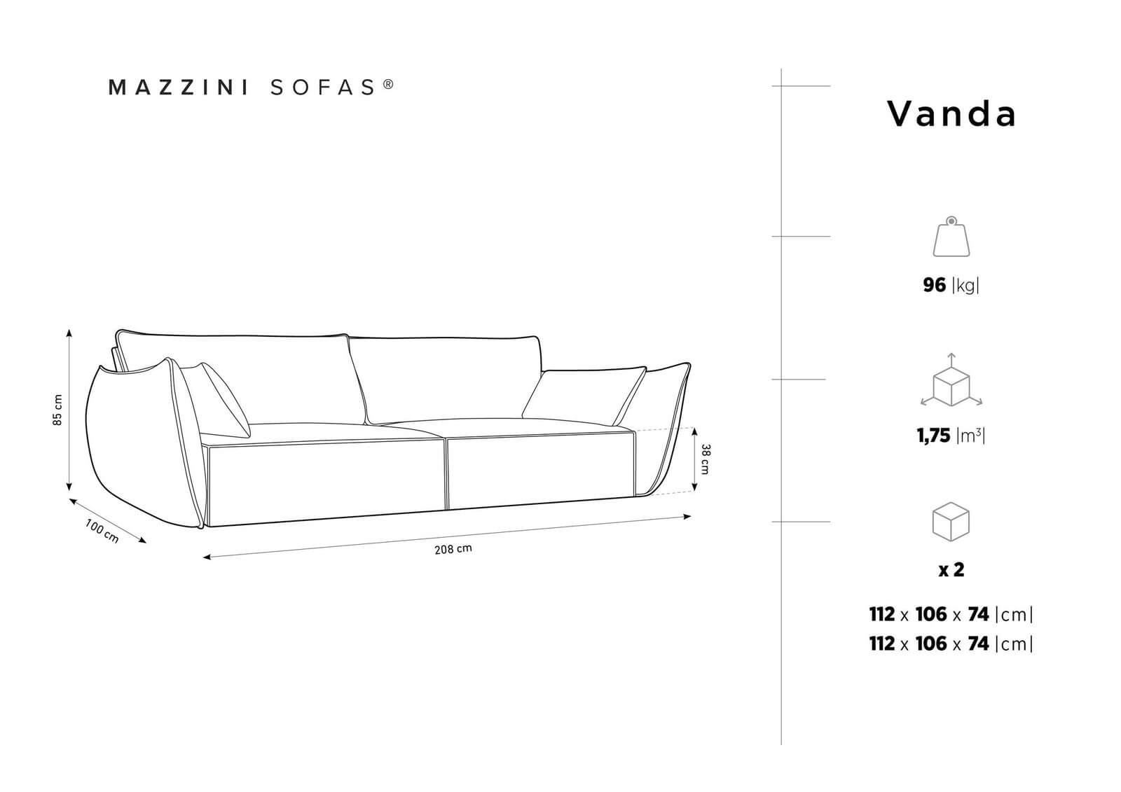 Siedzisko trzyosobowej kanapy zostało wypełnione pianką poliuretanową o gęstości 30 kg/m³, która doskonale dopasowuje się do kształtu ciała, zapewniając równomierne rozłożenie ciężaru. Wypełnienie stanowi także watolina o gramaturze 200 g/m², która tworzy miękką warstwę, dodającą wygody.