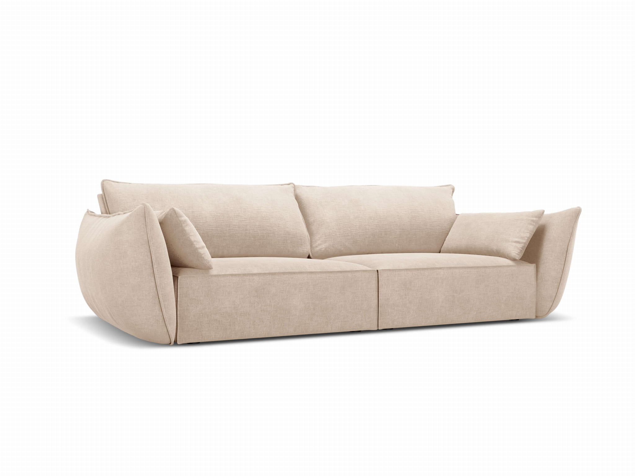 Beżowa, elegancka kanapa Vanda dla trzech osób, tapicerowana przytulnym szenilem Over The Horizon 08.