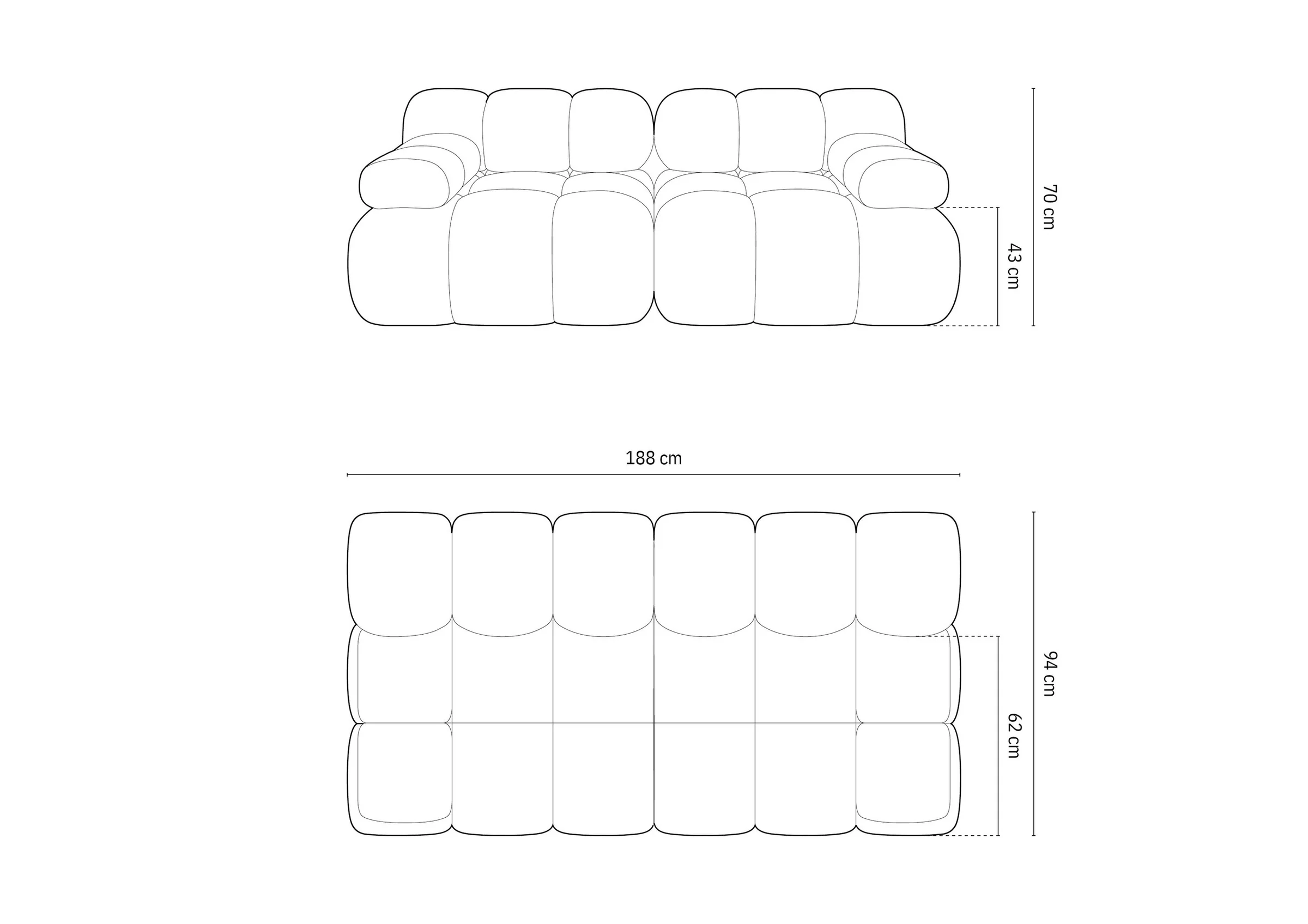 Sylwetki sof, inspirowane innowacyjnym projektem z lat 70., perfekcyjnie łączą się z ponadprzeciętnym komfortem. Forma mebla jest niesamowicie przytulna, a „baloniaste” moduły wydają się jednocześnie miękkie i sprężyste. Ich wyjątkowość wynika m.in. z licznych, efektownych marszczeń na tapicerce. Śmiałe połączenie stylów nikogo nie pozostawia obojętnym. Kubiczne kształty z zaokrąglonymi krawędziami są eleganckie, ale mają w sobie szczyptę nonszalancji. Wielość modułów pozwala ci na tworzenie indywidualnych kombinacji dopasowanych do wnętrza i twoich estetycznych potrzeb.