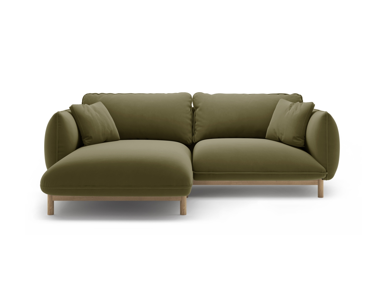 Narożnik Ada w kolorze zieleni to mebel, który przenosi spokój natury prosto do Twojego salonu. Połączenie kojącej, zielonej barwy tapicerki z solidną, drewnianą podstawą tworzy harmonijną całość, idealną do wnętrz w stylu skandynawskim lub boho. Dzięki osadzeniu na wysokich nóżkach, narożnik zachowuje wizualną lekkość, a szeroki szezlong zaprasza do wygodnego wypoczynku w pozycji półleżącej.