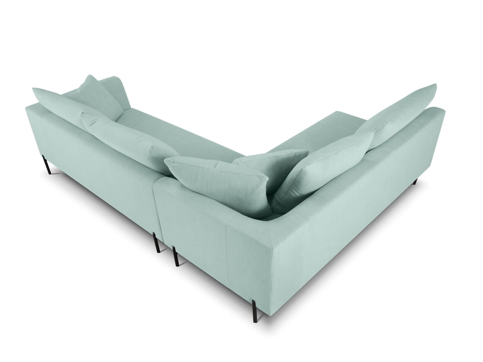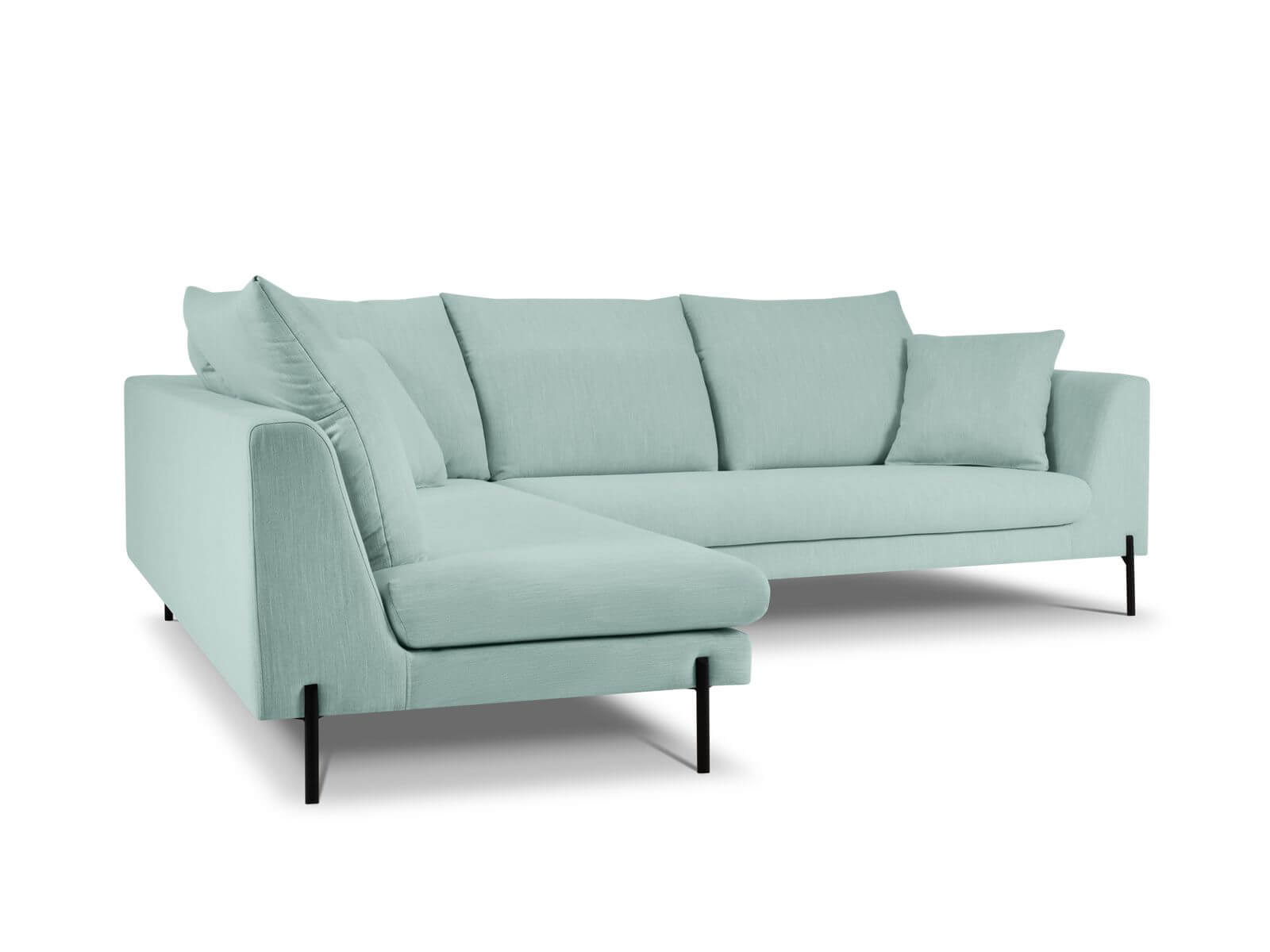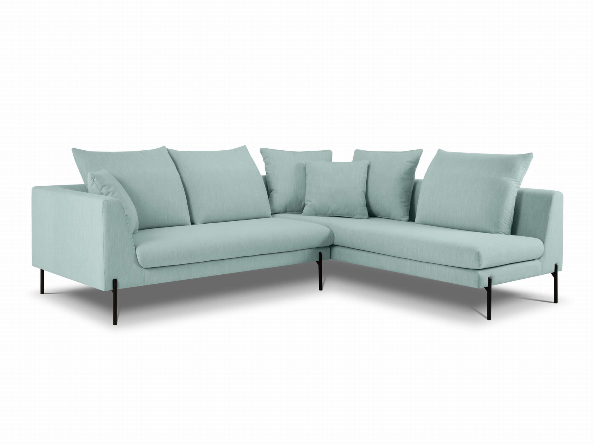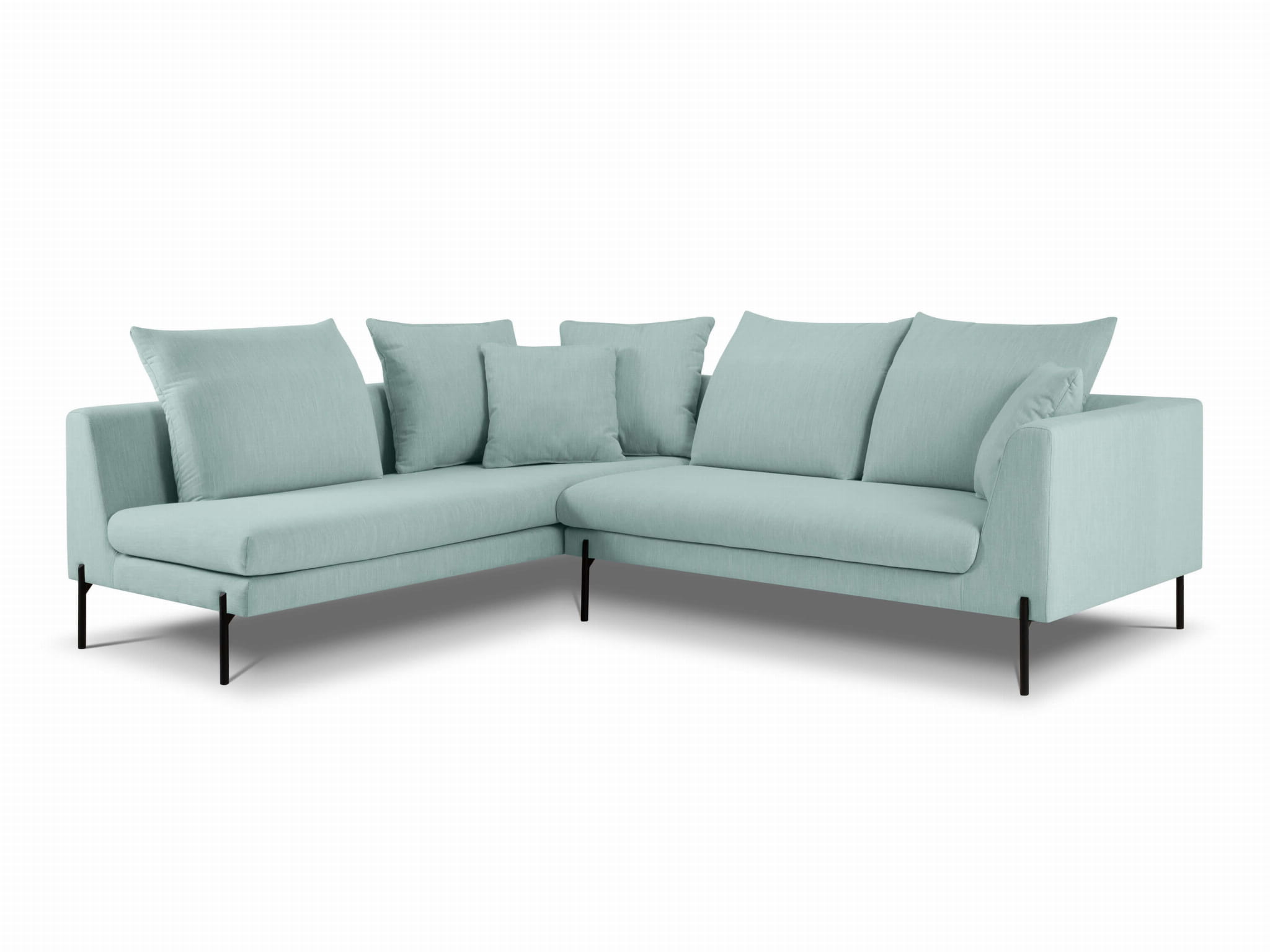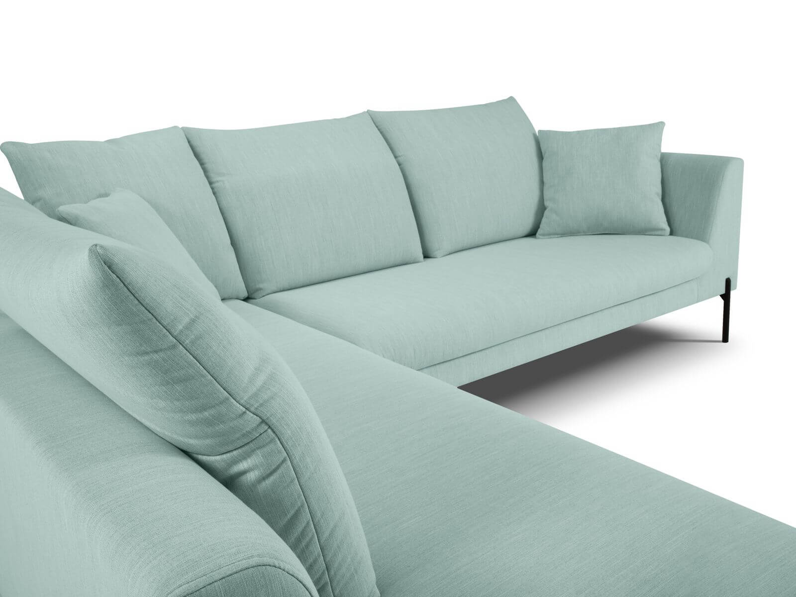 Minimalistyczne, czarne nóżki z metalu podkreślają lekkość narożnika, który zdaje się unosić w powietrzu. Zaletą tego rozwiązania jest także ułatwione utrzymanie czystości powierzchni pod meblem.