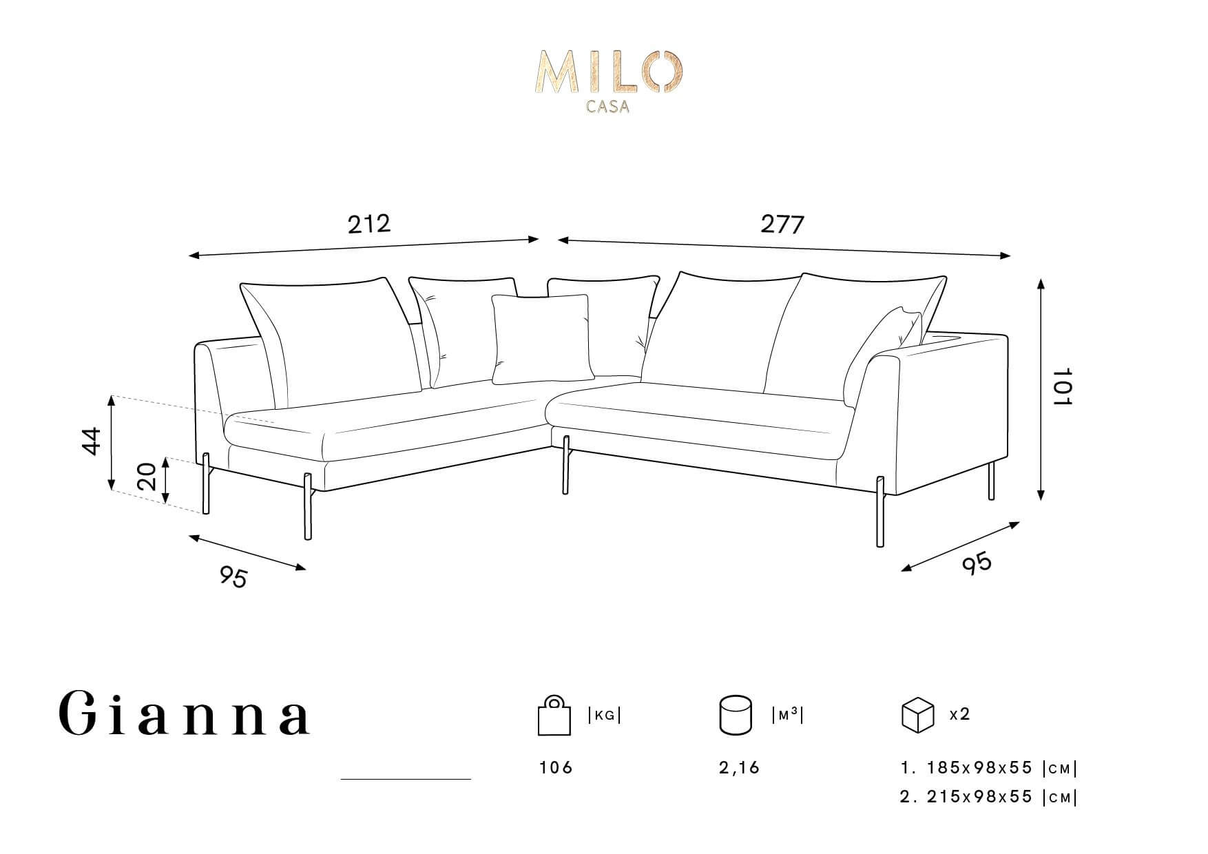 Do narożnika dołączone są dwie dekoracyjne poduszki o wymiarze 48x48cm. Wzmacniają one wygodę użytkowania oraz dopełniają piękno mebla Gianna.