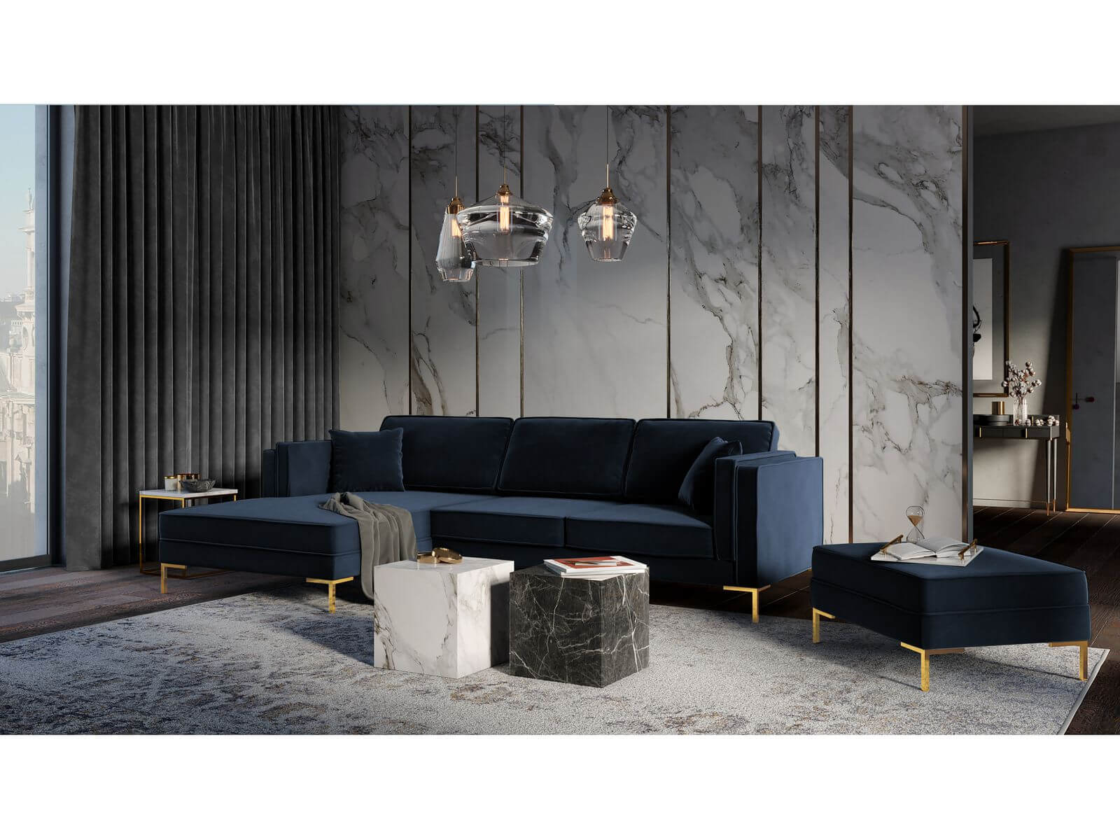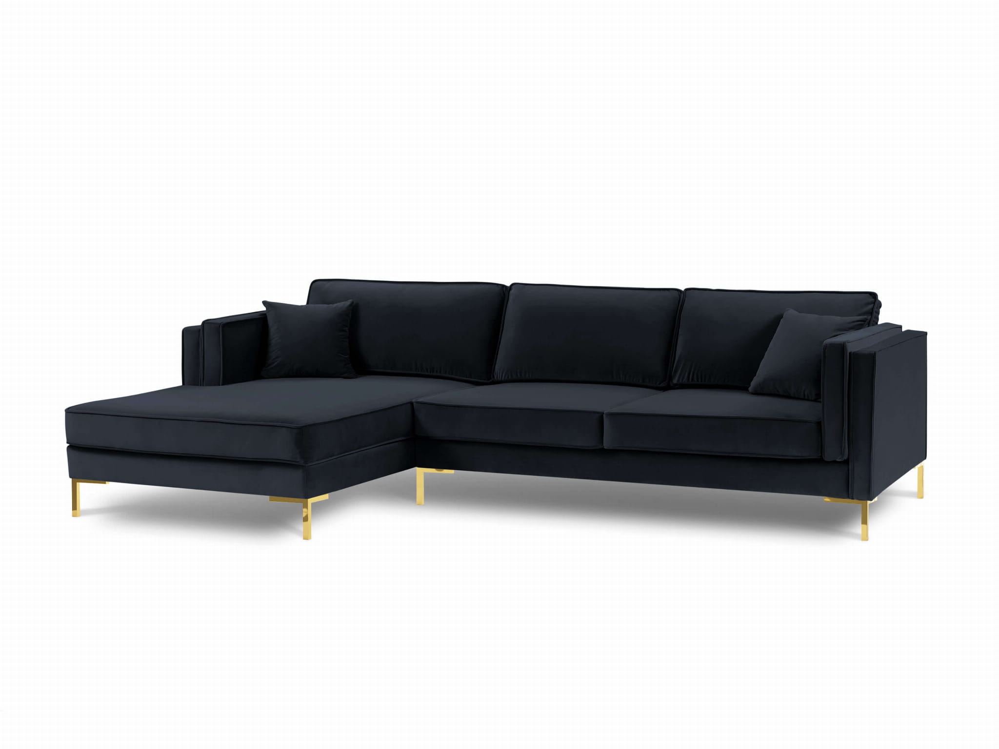 Sofa narożna Luis aksamit granatowy na złotych nóżkach