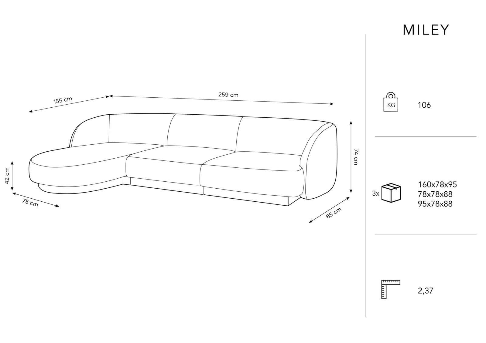 Sofa narożna Miley wykończona przytulną, miękką tkaniną w kolorze jasnego beżu. Zaokrąglone kształty narożnika idealnie wpasują się w nowoczesne trendy wnętrzarskie, niosąc za sobą styl i poczucie harmonii.