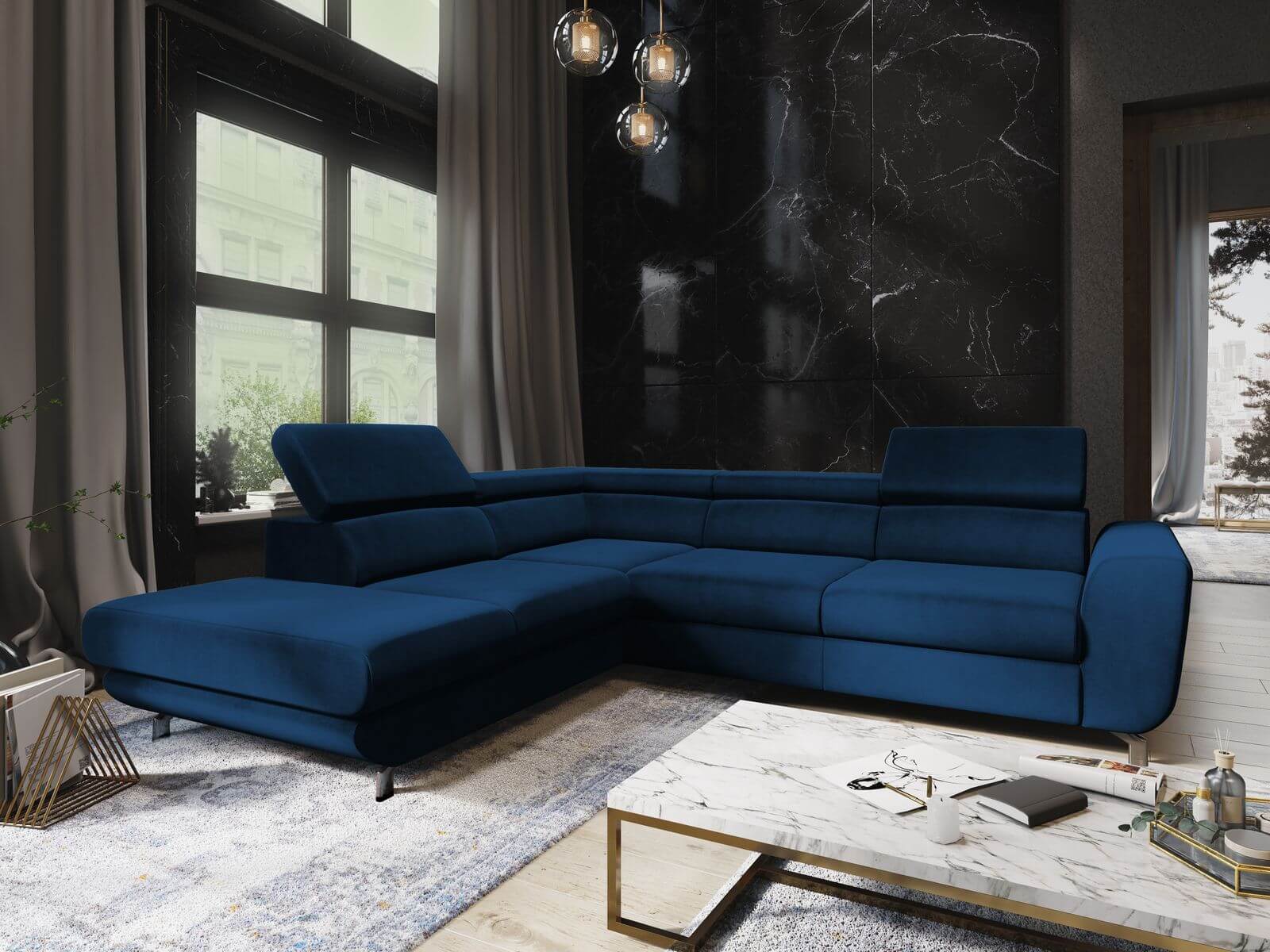 W tej ofercie prezentujemy rozkładany narożnik Mario w kolorze atramentowym/królewskim niebieskim - Riviera 81 na srebrnych metalowych nóżkach.