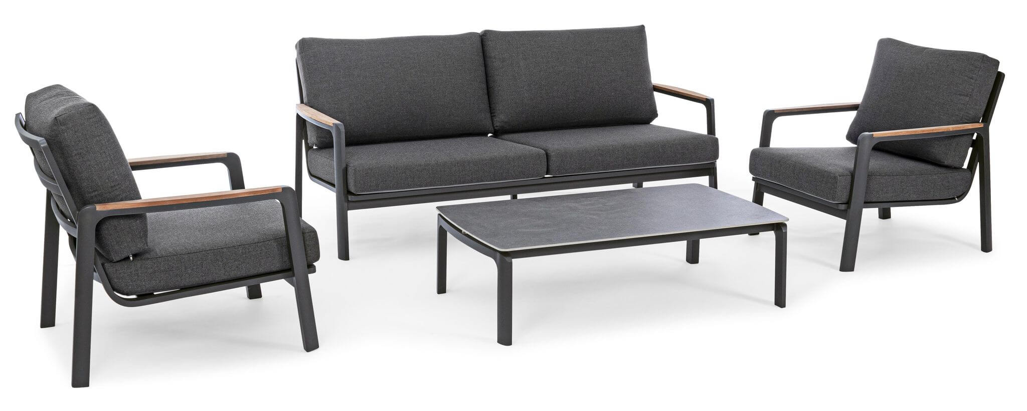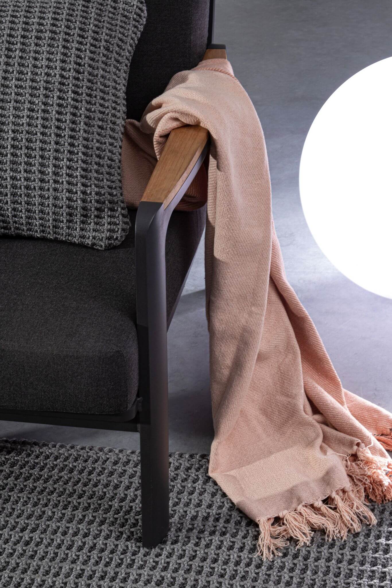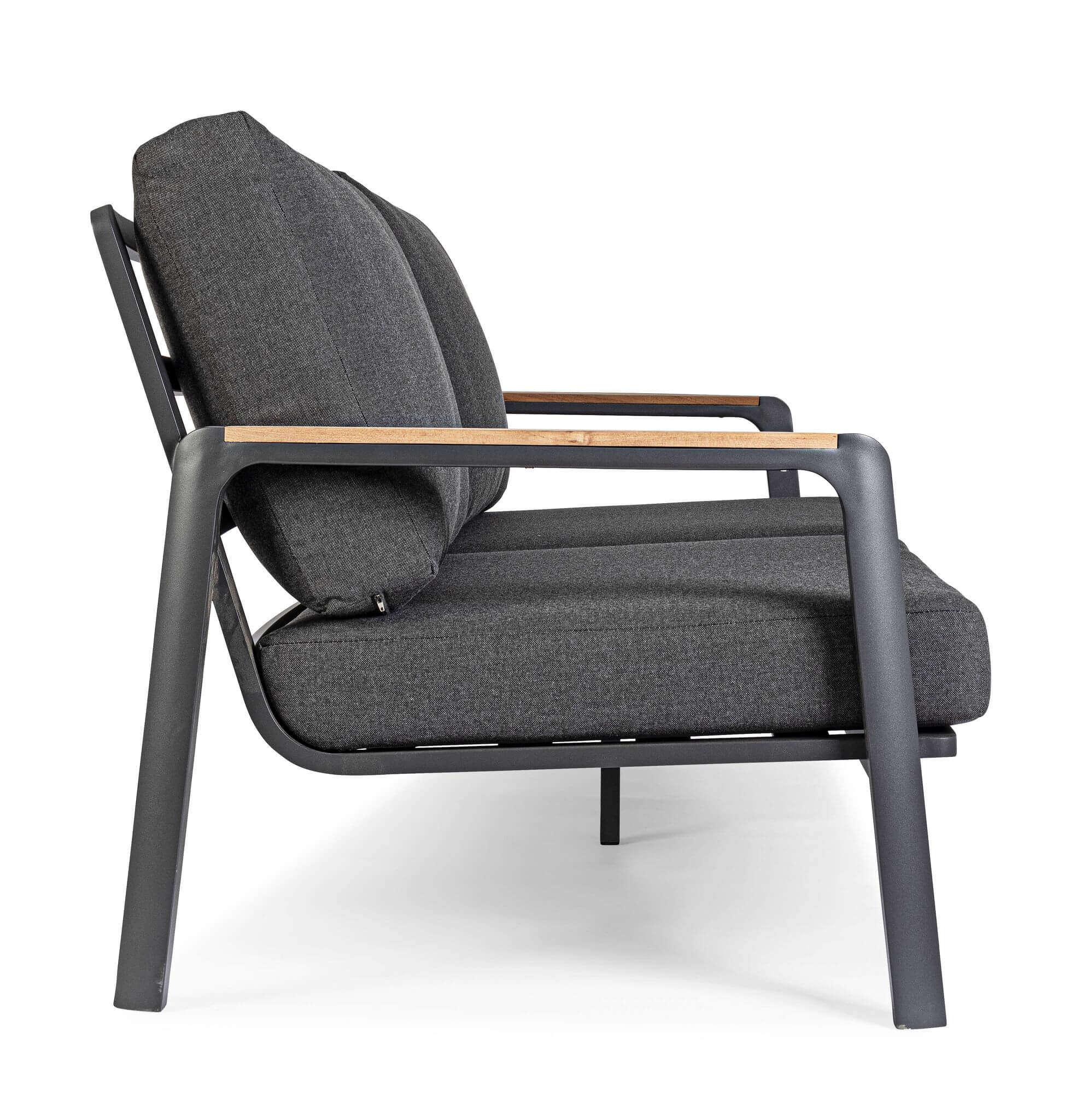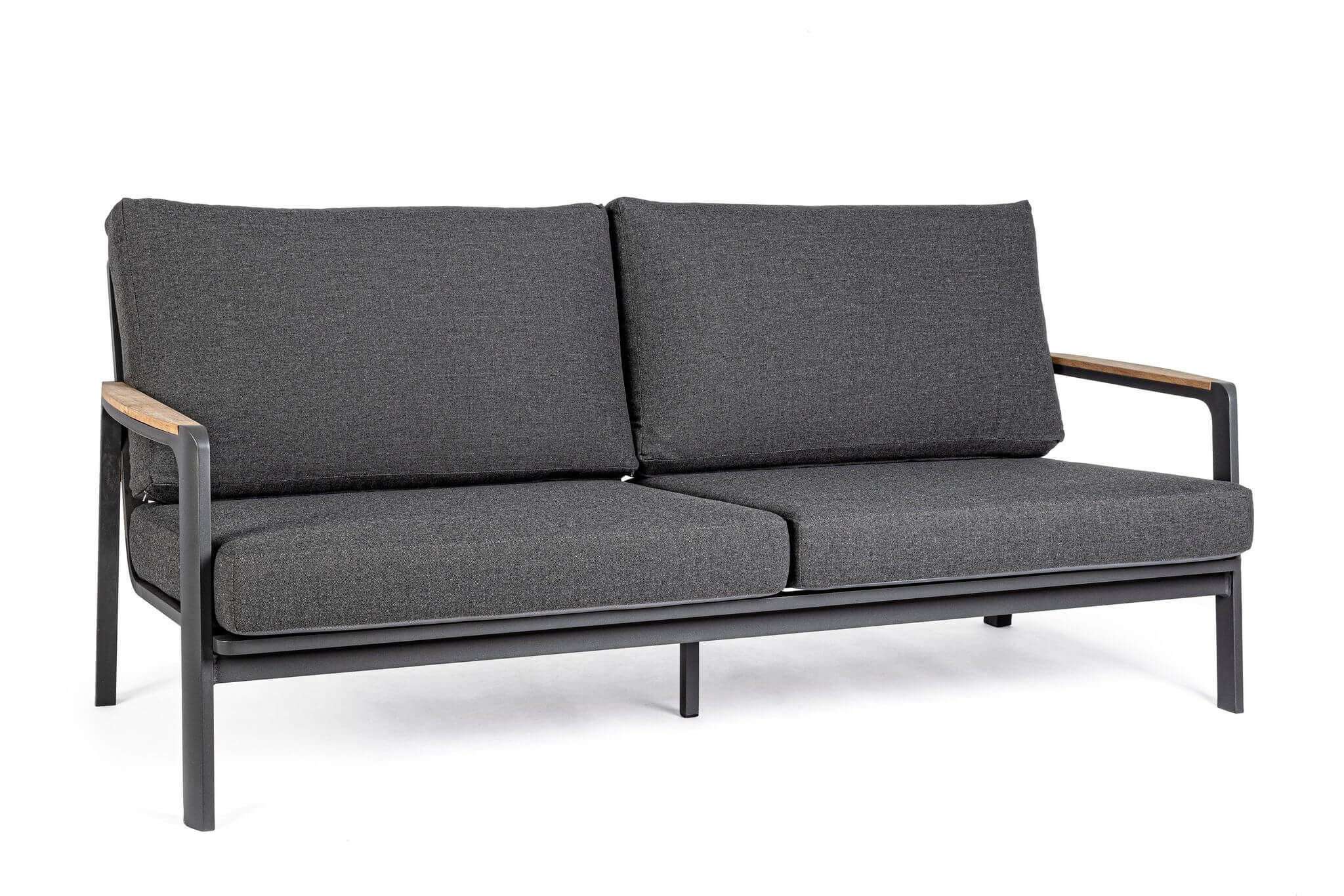 Podłokietniki wygodnej sofy tarasowej zdobione są elementami z drewna tekowego, które dodają oryginalności i stylu.