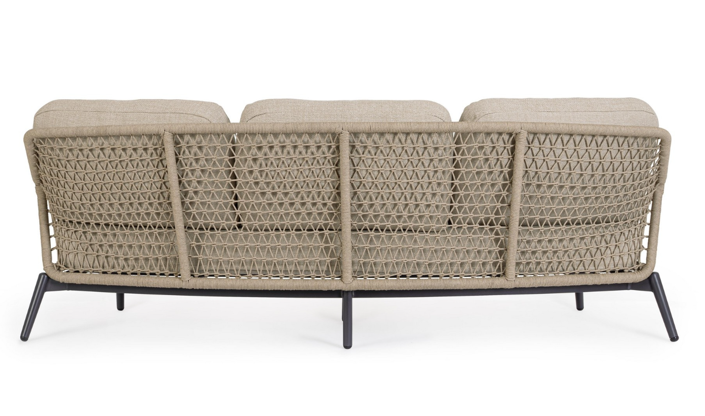 Sofa ogrodowa Eulero w antracytowej wersji kolorystycznej to propozycja dla miłośników wyrazistego, współczesnego designu połączonego z bezkompromisową wygodą. Jej solidną bazę stanowi konstrukcja z aluminium malowanego proszkowo w głębokim, ciemnym odcieniu (Charcoal), który przepięknie kontrastuje z jasnymi, miękkimi poduszkami. Tył oraz boki mebla wykończono staranną plecionką z liny syntetycznej, co nadaje tej obszernej, ponad dwumetrowej bryle intrygującej wizualnej lekkości i modnego, rzemieślniczego charakteru.