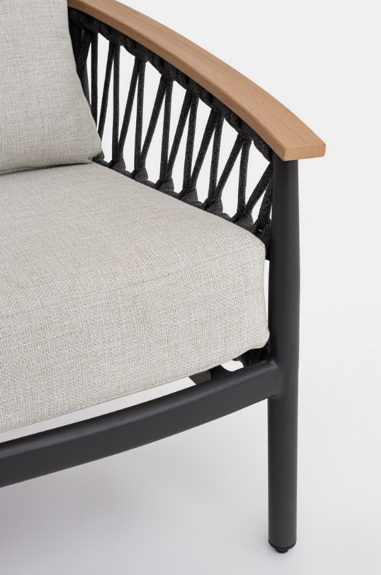 Prawdziwą ozdobą sofy Fenix jest tył jej oparcia oraz boki, które wykończono efektowną, geometryczną plecionką z liny syntetycznej Olefin. Ten rzemieślniczy akcent nadaje imponującej bryle wizualnej lekkości i przepięknie prezentuje się z każdej perspektywy. Producent nie zapomniał również o maksymalnym komforcie – szerokie siedzisko i wysokie oparcie wyposażono w grube, miękkie poduszki obszyte wodoodporną tkaniną Olefin. Materiał ten doskonale znosi poranną rosę, jest wysoce odporny na promieniowanie UV, a dzięki zamkom błyskawicznym pokrowce można łatwo zdjąć i uprać.