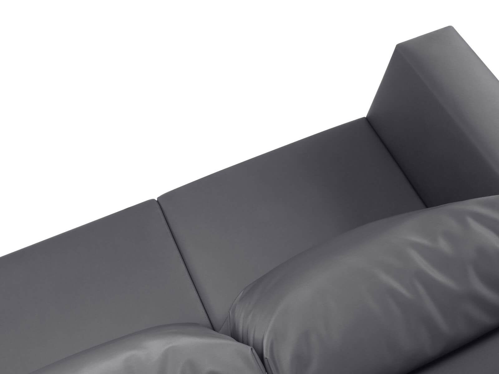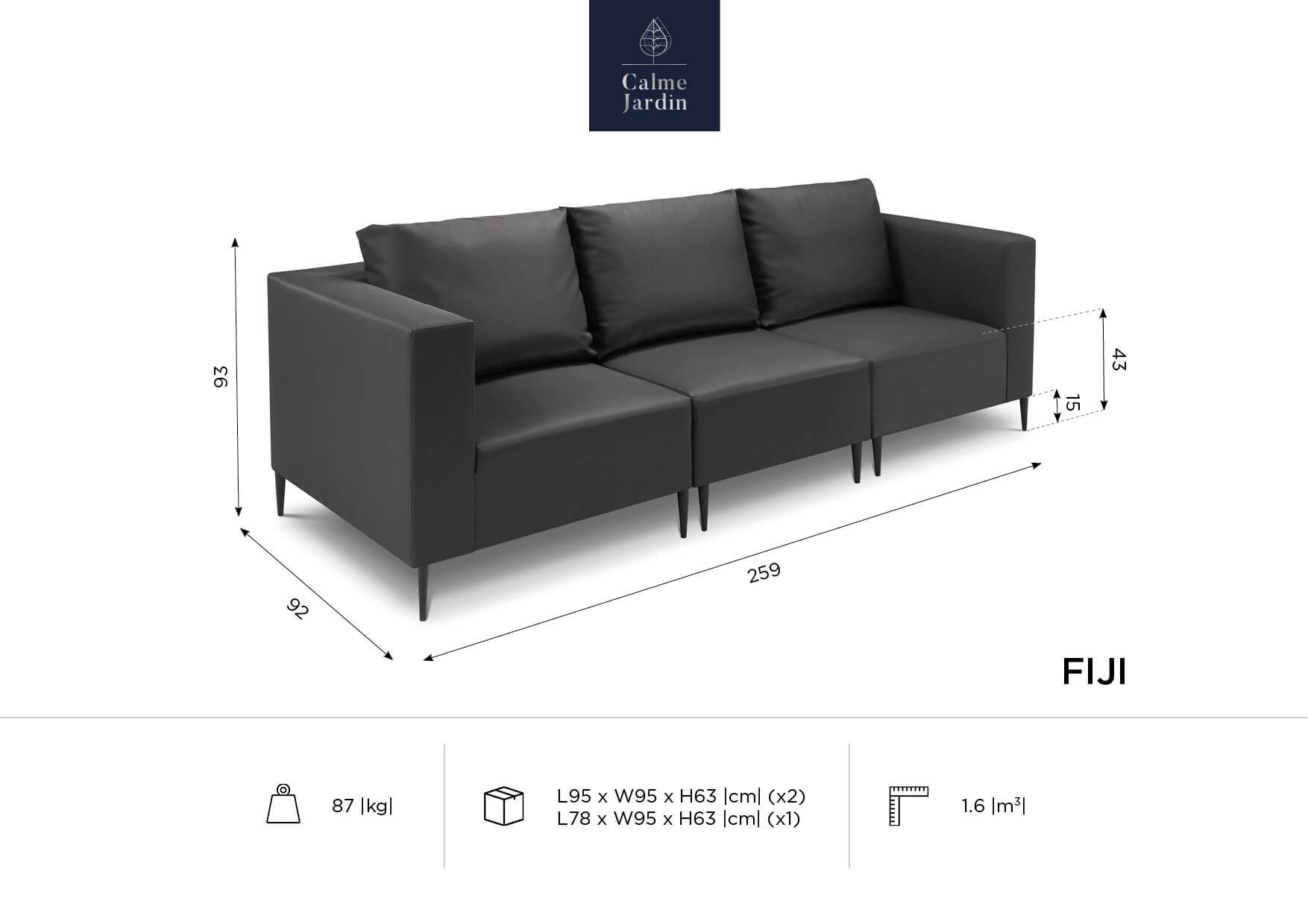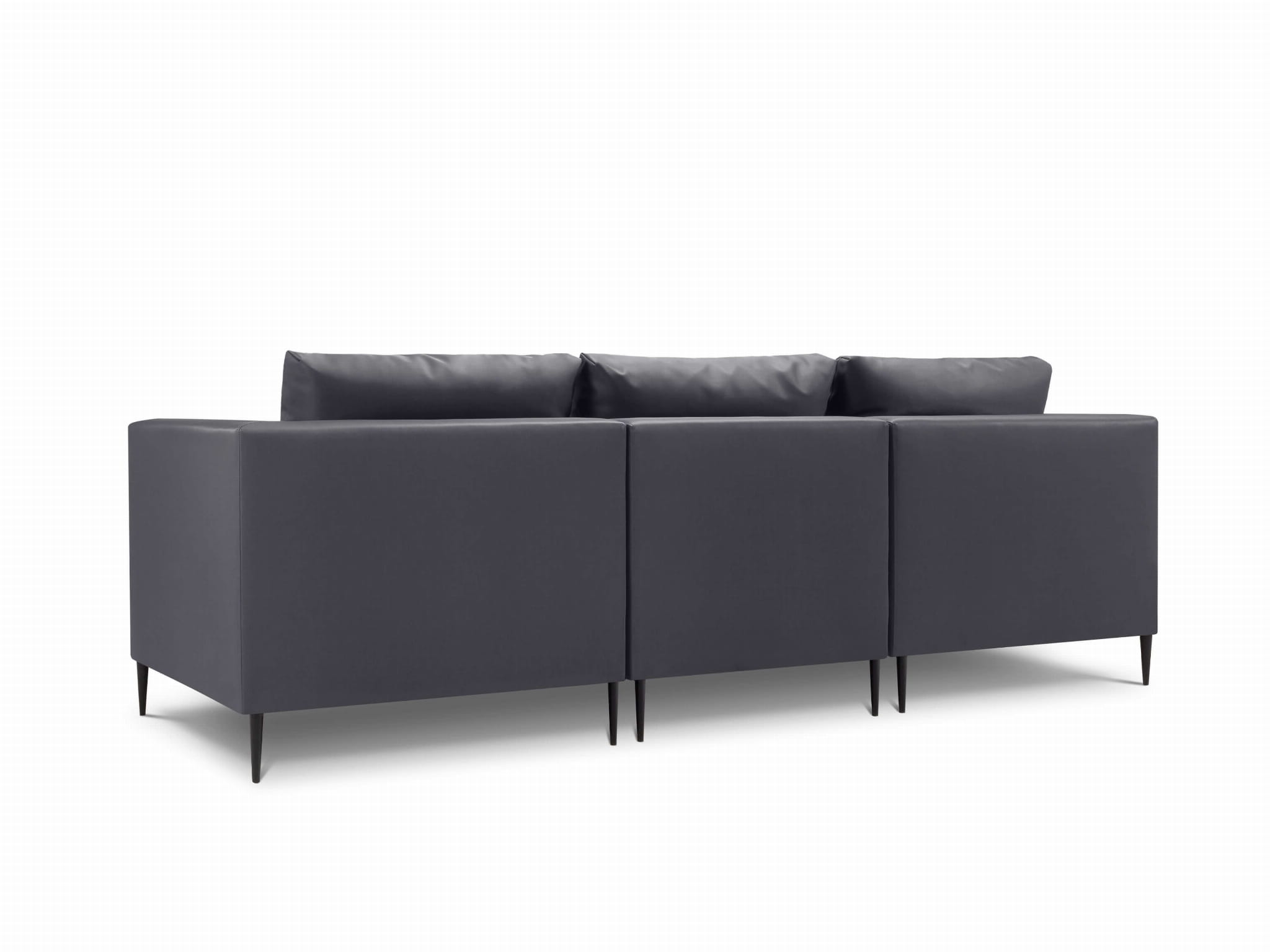 3-osobowa, szara sofa do ogrodu ustawiona jest na czarnych, stabilnych nóżkach z metalu.