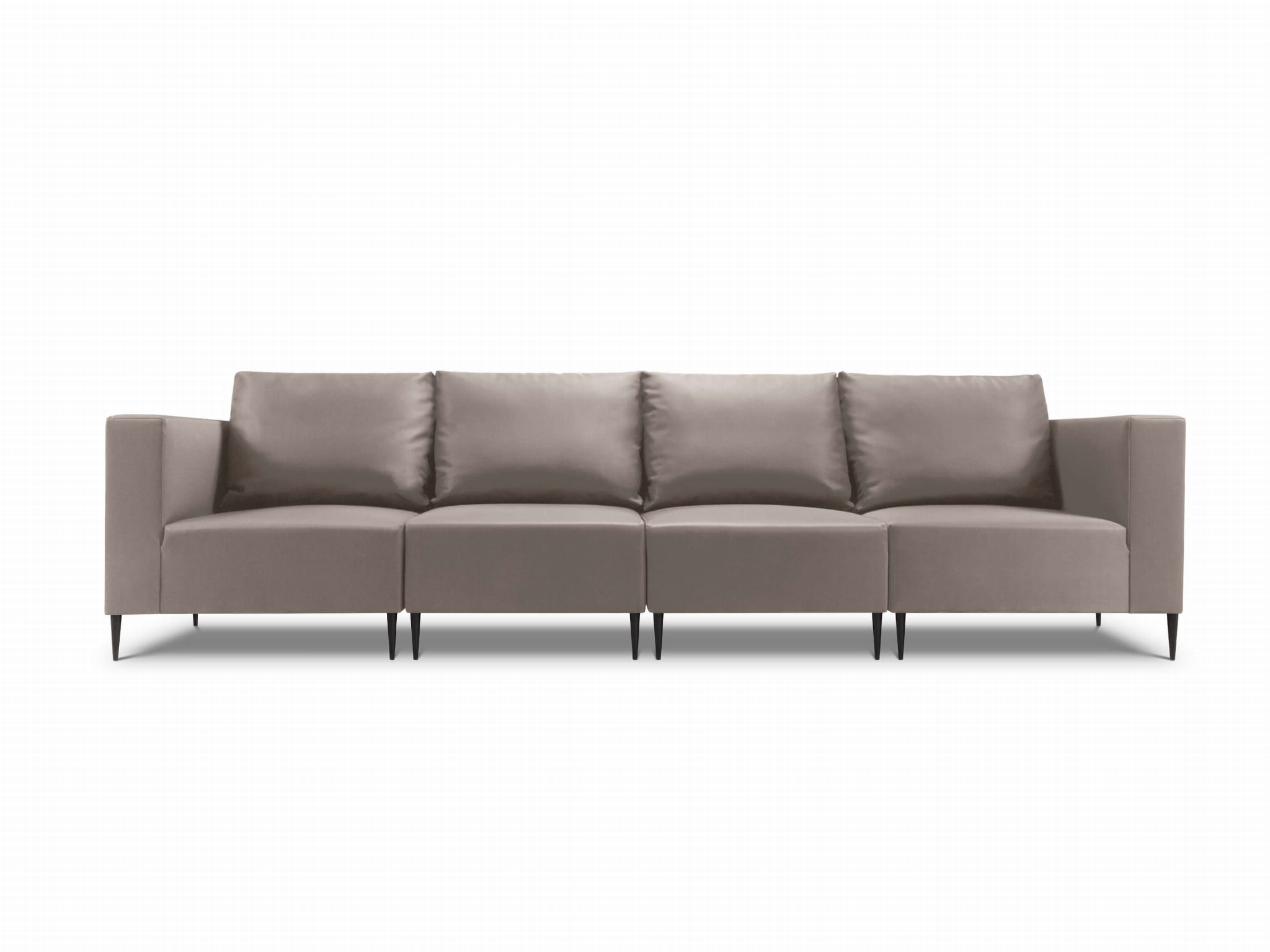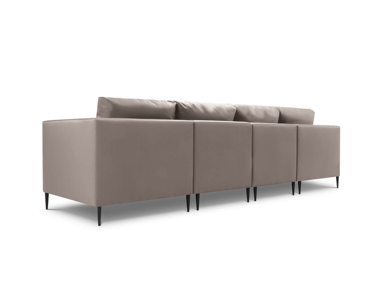 4-osobowa, beżowa sofa do ogrodu ustawiona jest na czarnych, stabilnych nóżkach z metalu.