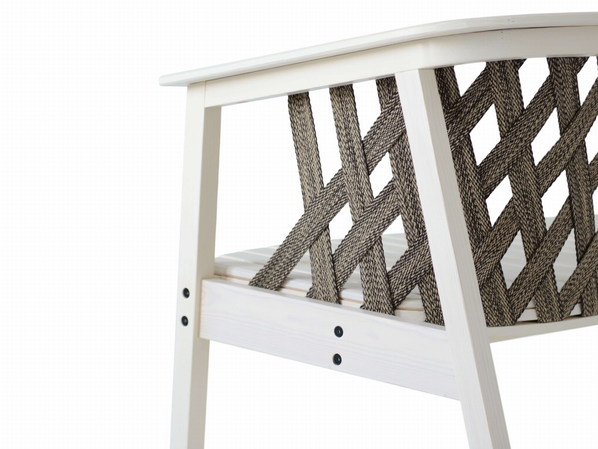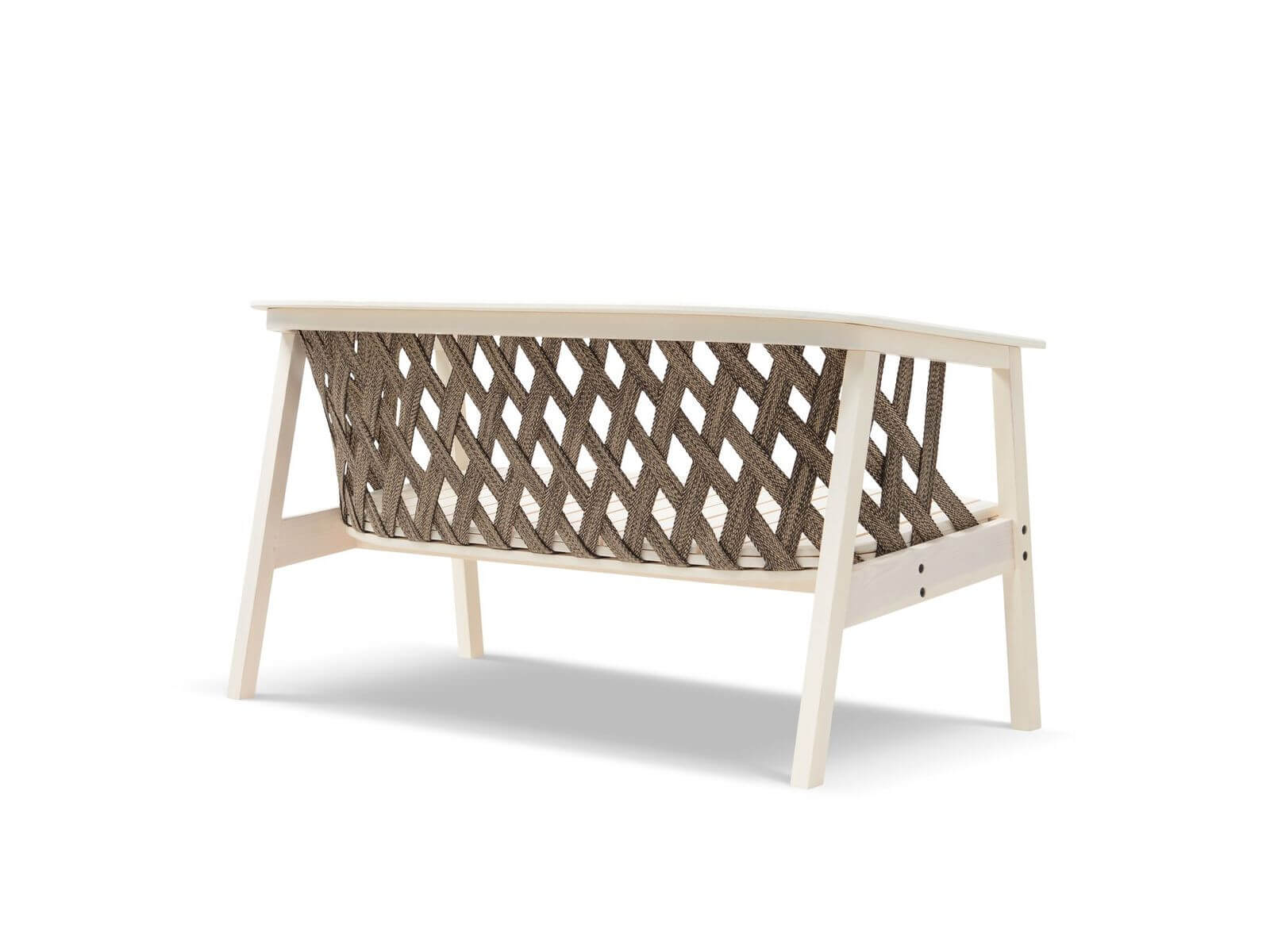 Konstrukcja 2-osobowej sofy ogrodowej została wykonana z drewna jesionowego. Oparcie stanowi splot liny, odpornej na warunki atmosferyczne.