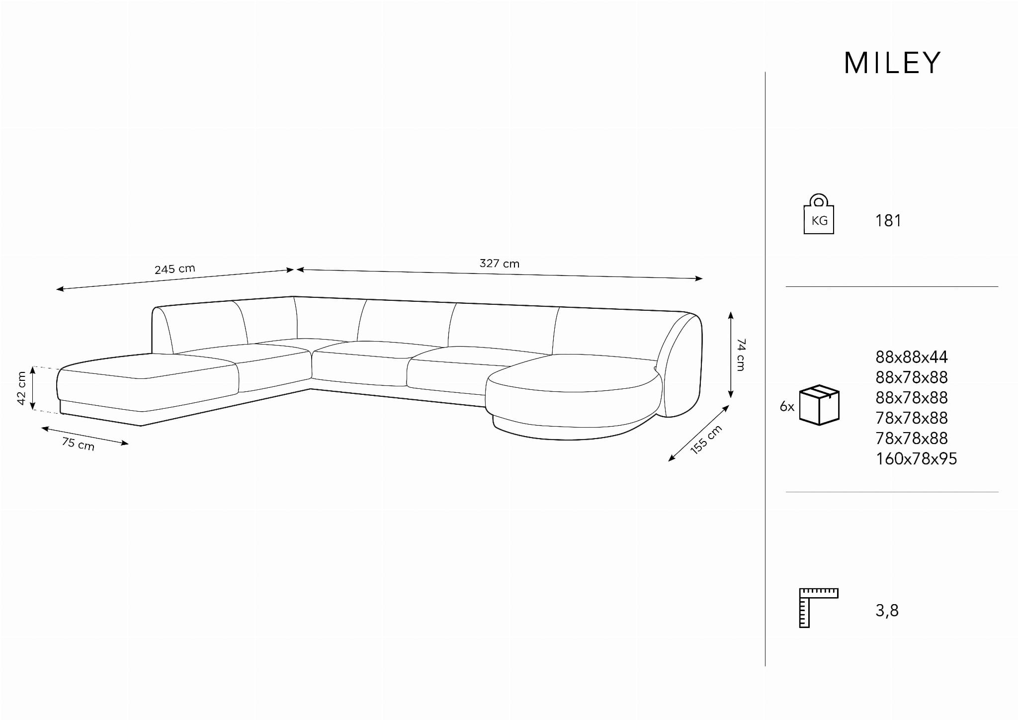 Sofa narożna posiada sześć siedzisk, a jej maksymalne zalecane obciążenie wynosi aż 650 kg.