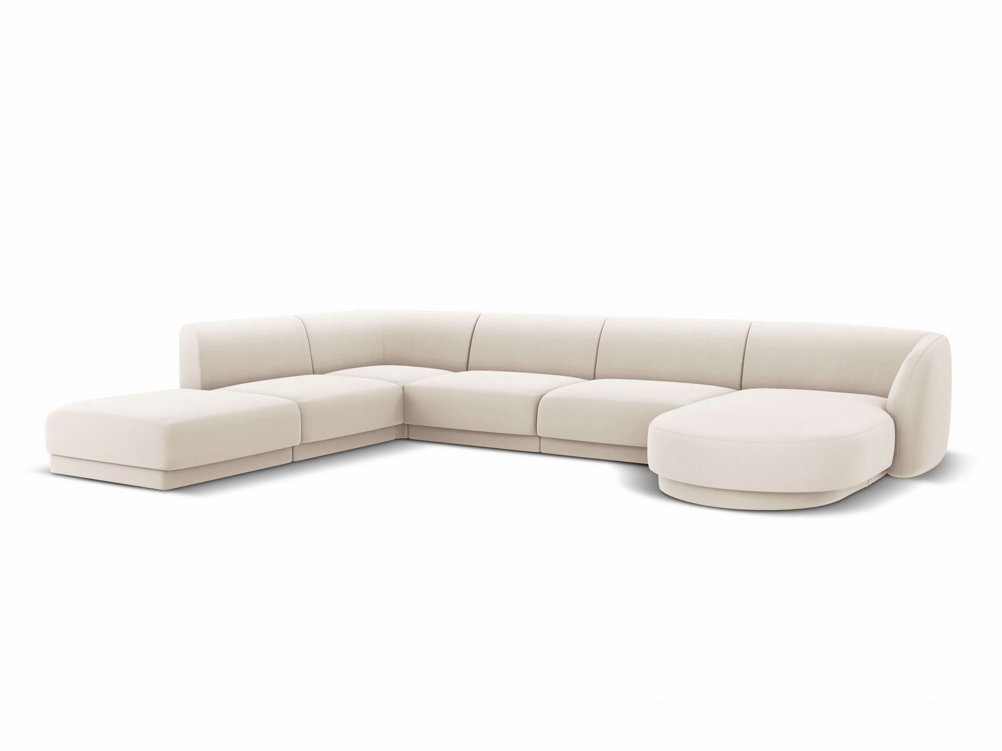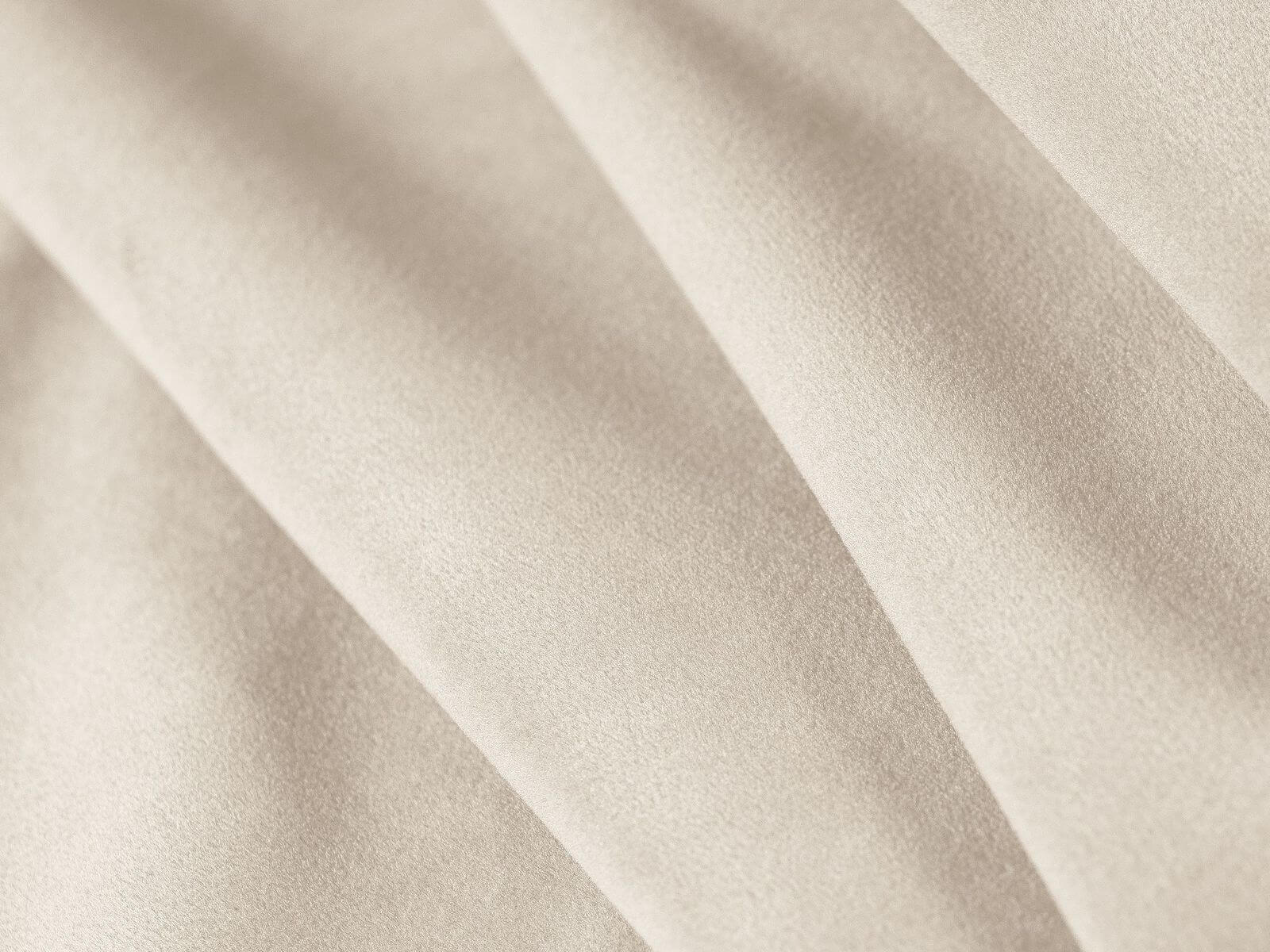 Jasno beżowa sofa panoramiczna Miley tapicerowana jest syntetyczną tkaniną imitującą aksamit - Bluvel 22. Delikatny połysk materiału sprawia, że jest on dobrym wyborem do eleganckich projektów wnętrz.