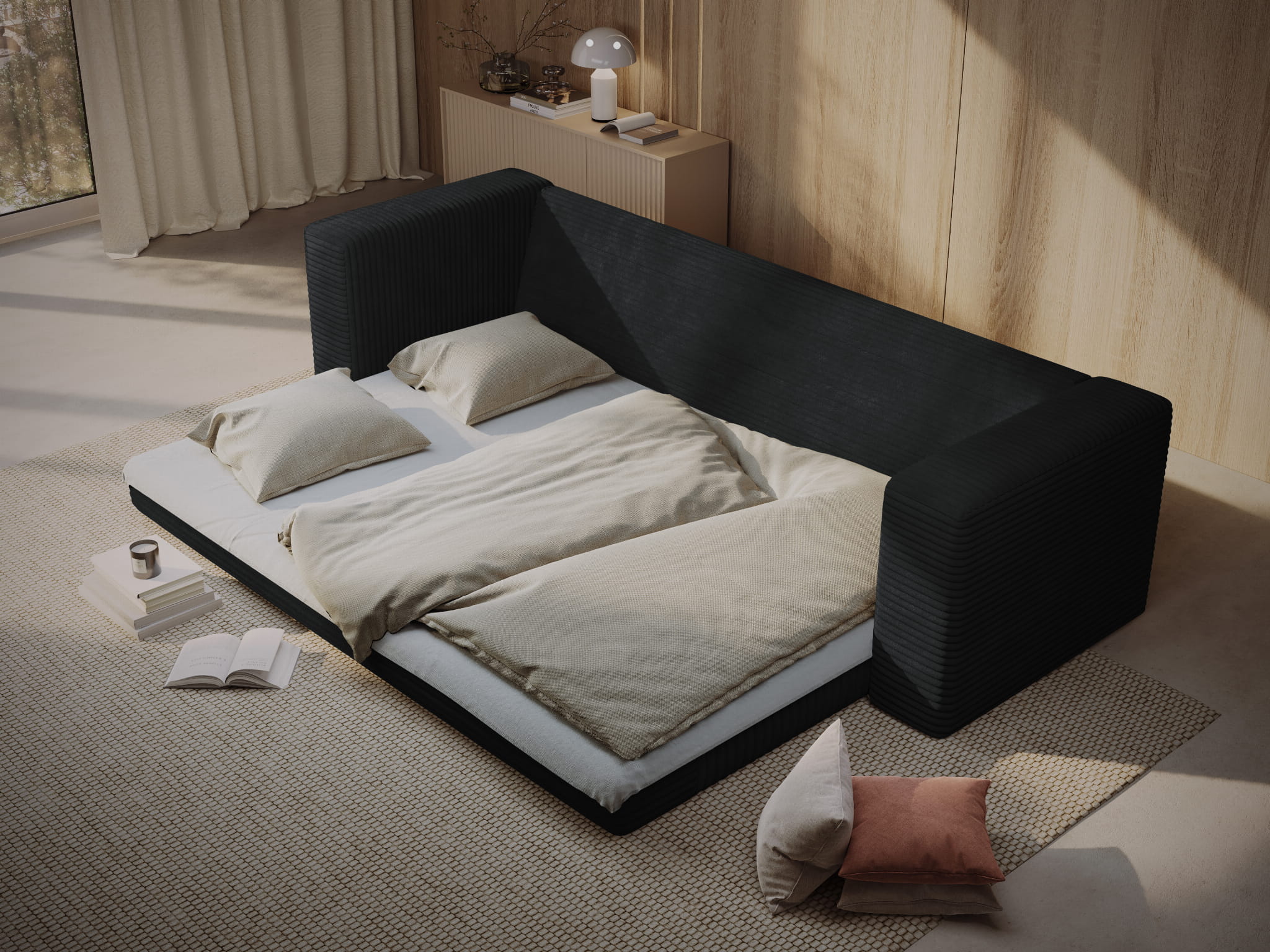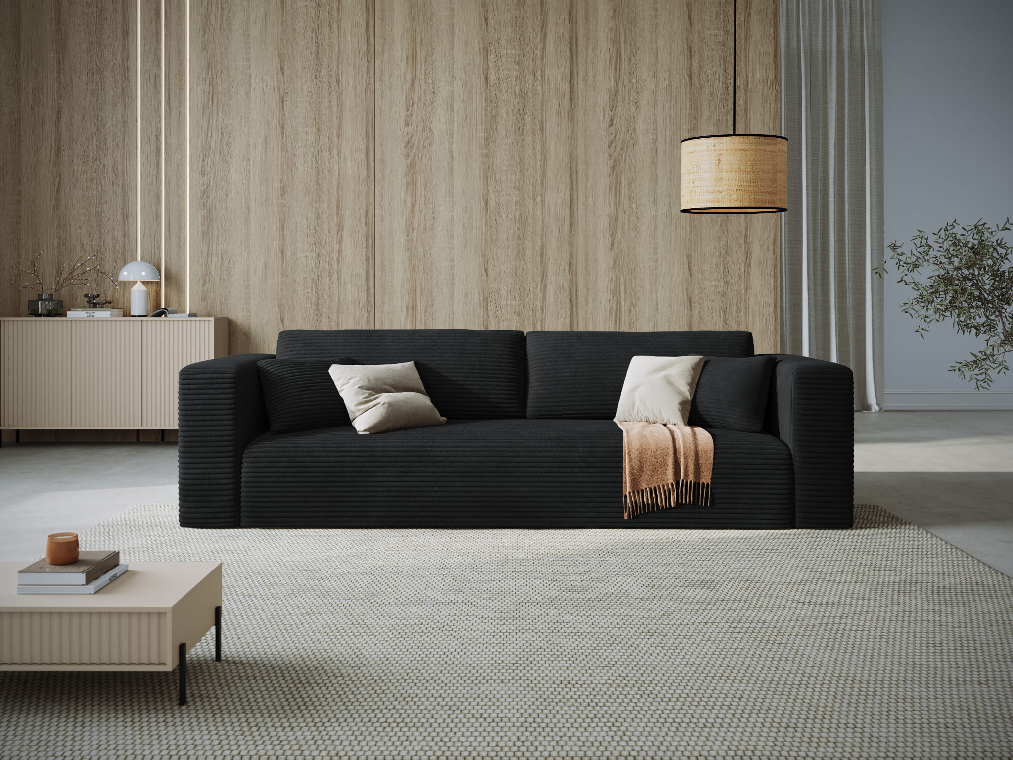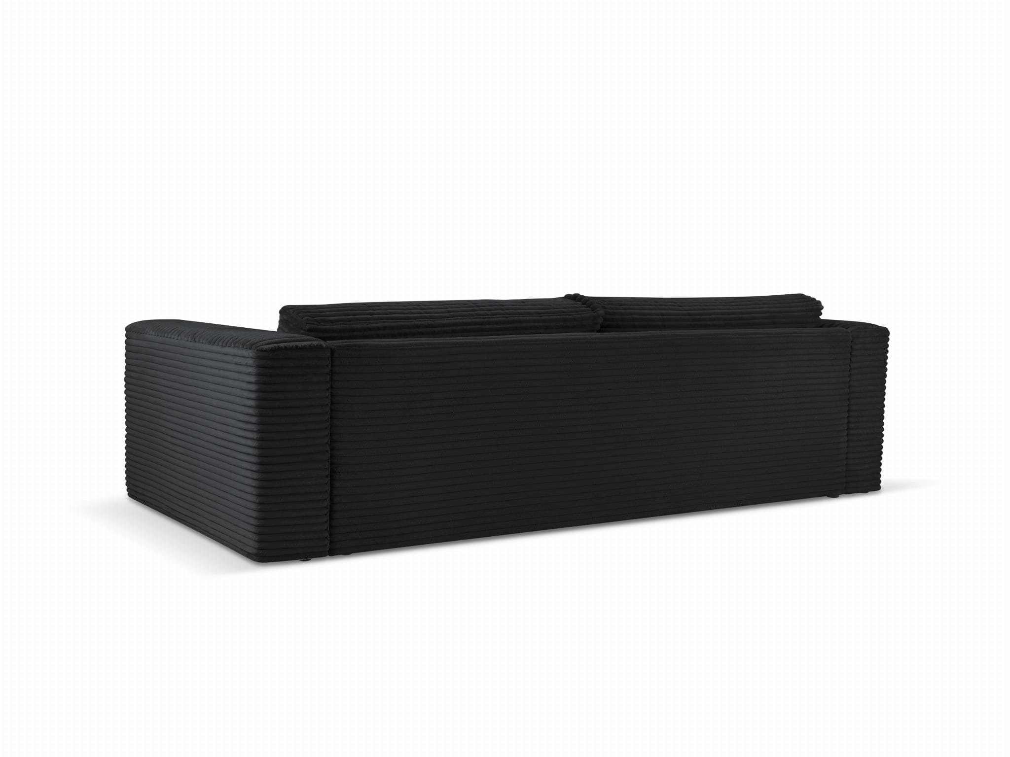 Sofa Diego jest tapicerowana tkaniną Mega Black. Pluszowa dzianina Mega wyróżnia się niesamowitą przytulnością. Długie, gęste włoski są bardzo przyjemne w dotyku. Kontakt z jej puszystą, miękką powierzchnią jest wyjątkowym doświadczeniem sensorycznym. Nie mniej spektakularny jest efekt wizualny, ponieważ materiał ma wygląd grubego sztruksu o bardzo szerokich prążkach. Runo układa się swobodnie tworząc delikatne cieniowanie. Na dużych powierzchniach mebli tkanina Mega prezentuje się wręcz awangardowo.