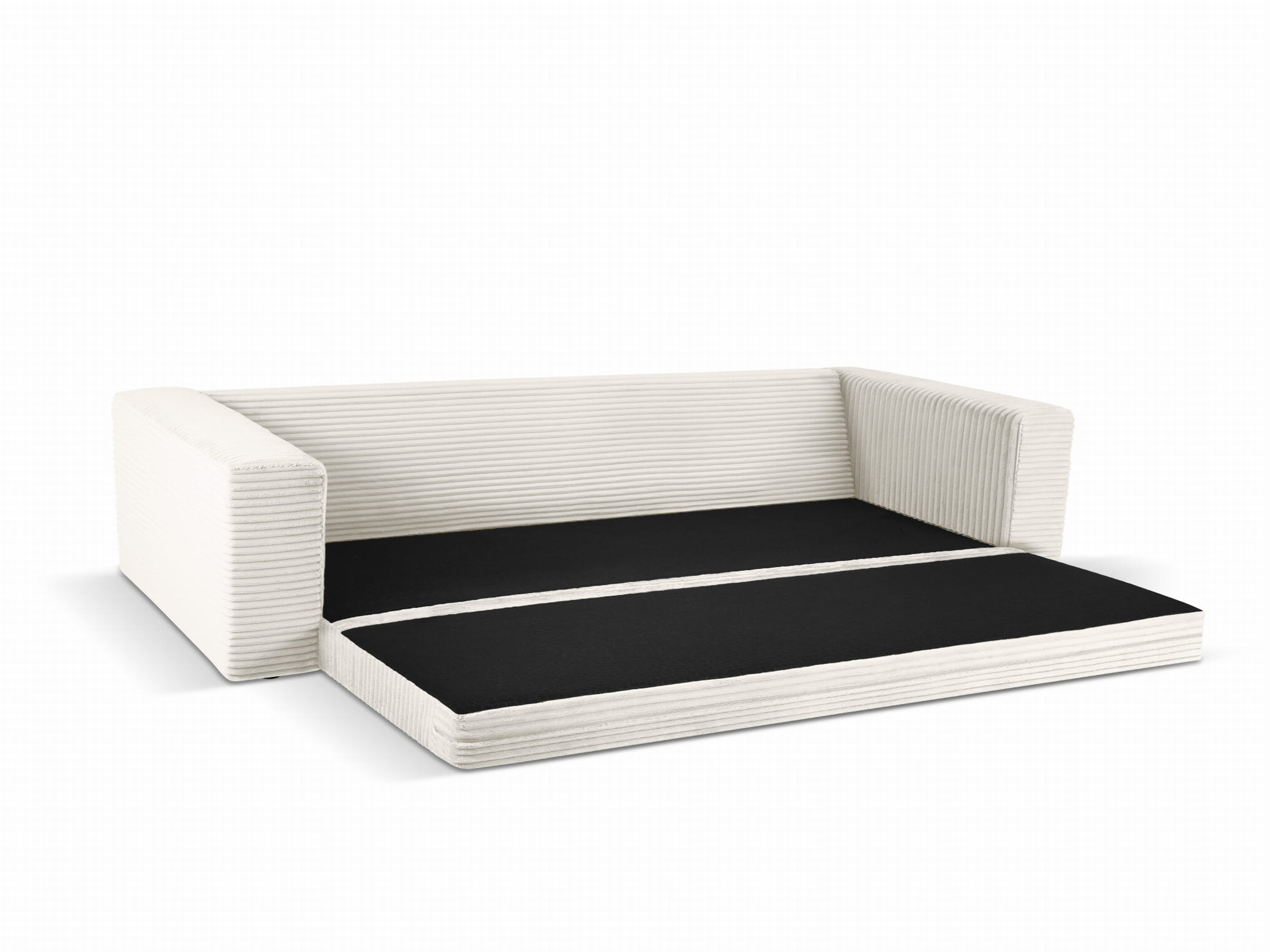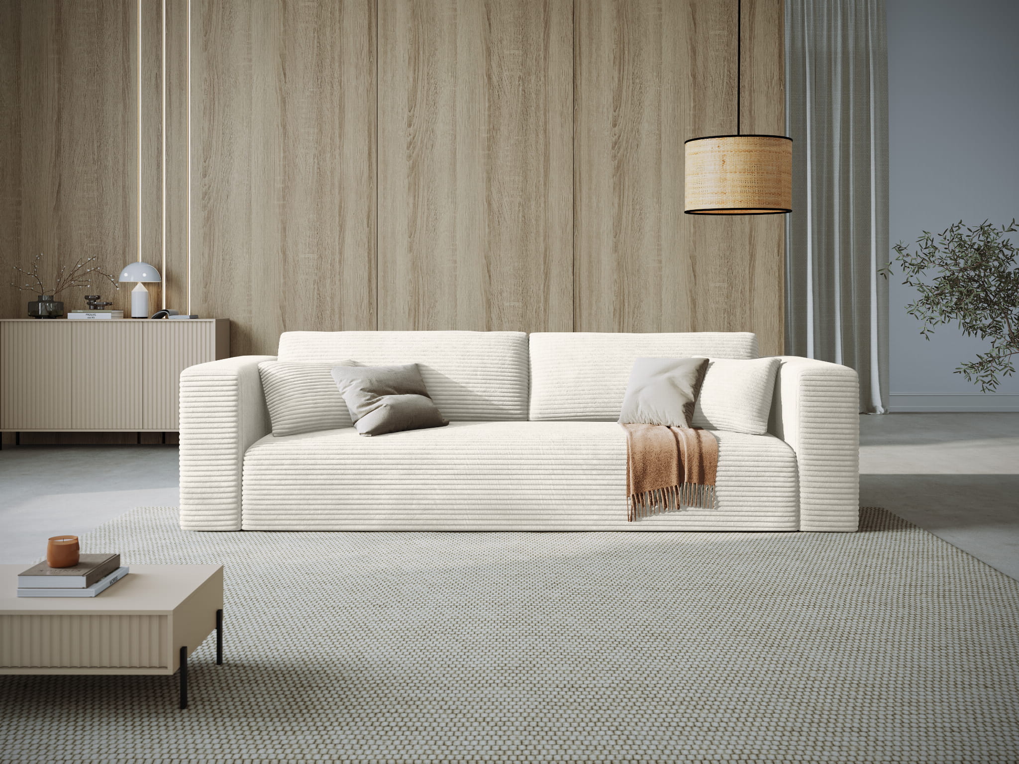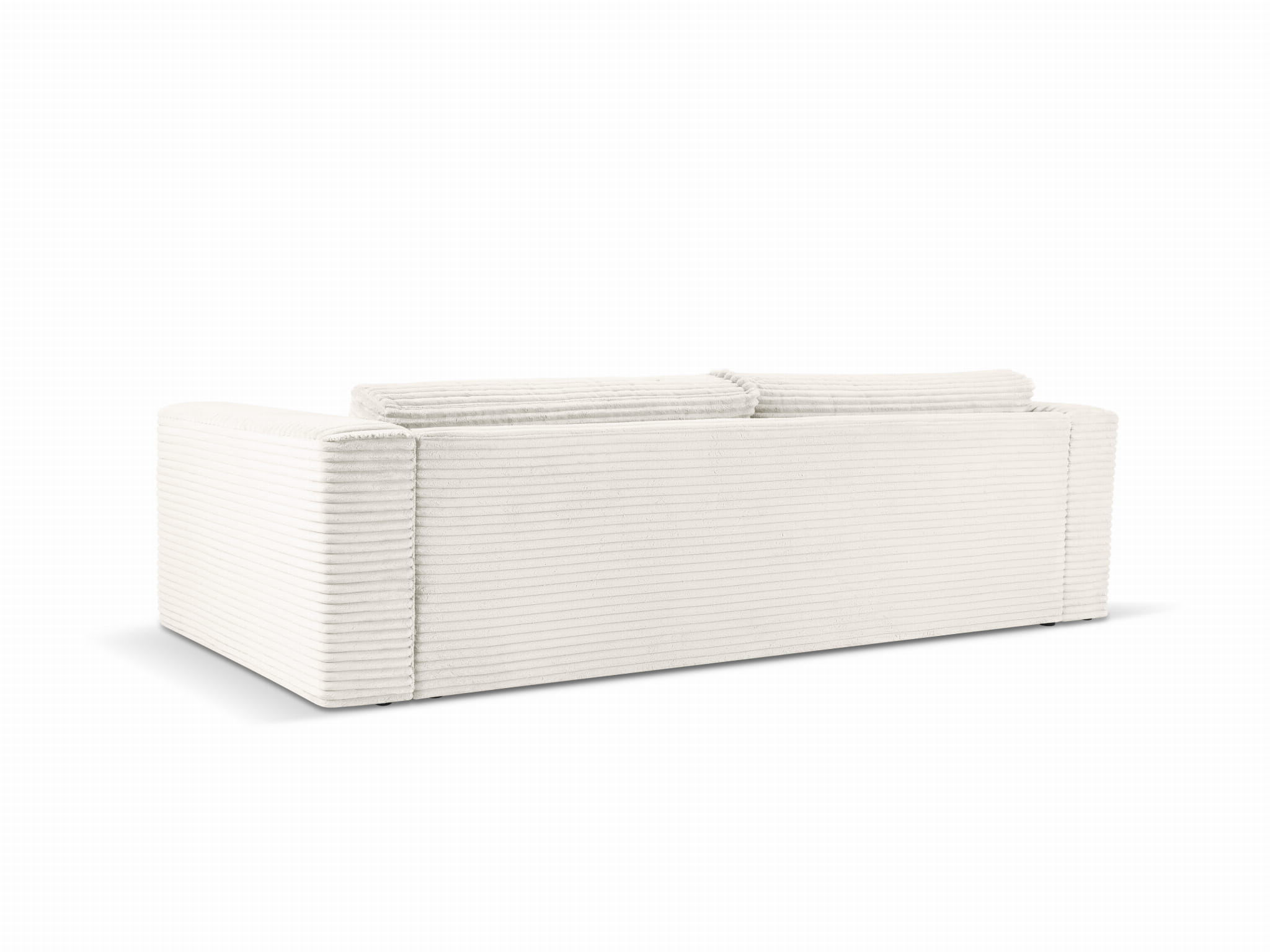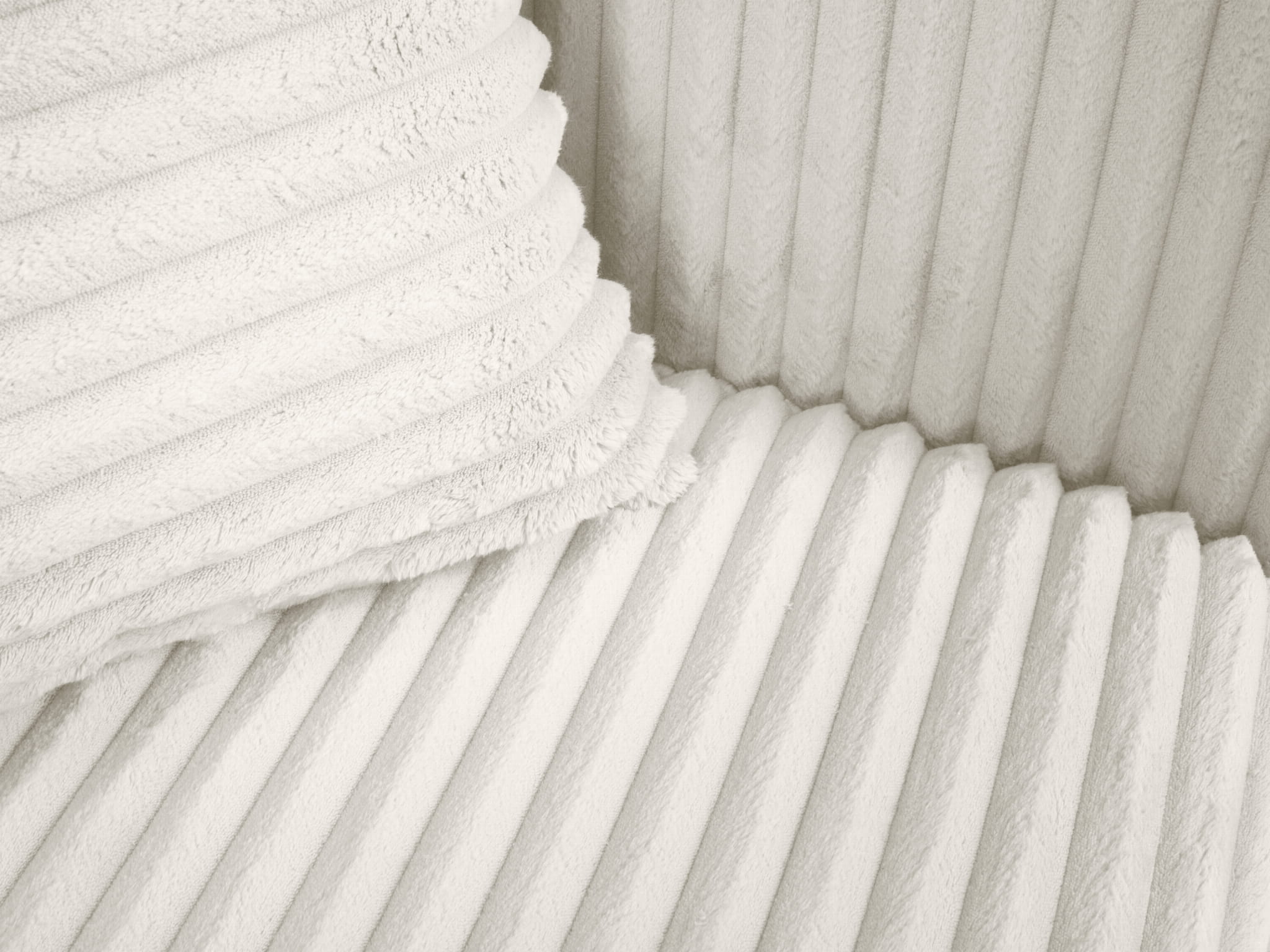 Sofa Diego jest tapicerowana tkaniną Mega Ivory. Pluszowa dzianina Mega wyróżnia się niesamowitą przytulnością. Długie, gęste włoski są bardzo przyjemne w dotyku. Kontakt z jej puszystą, miękką powierzchnią jest wyjątkowym doświadczeniem sensorycznym. Nie mniej spektakularny jest efekt wizualny, ponieważ materiał ma wygląd grubego sztruksu o bardzo szerokich prążkach. Runo układa się swobodnie tworząc delikatne cieniowanie. Na dużych powierzchniach mebli tkanina Mega prezentuje się wręcz awangardowo.