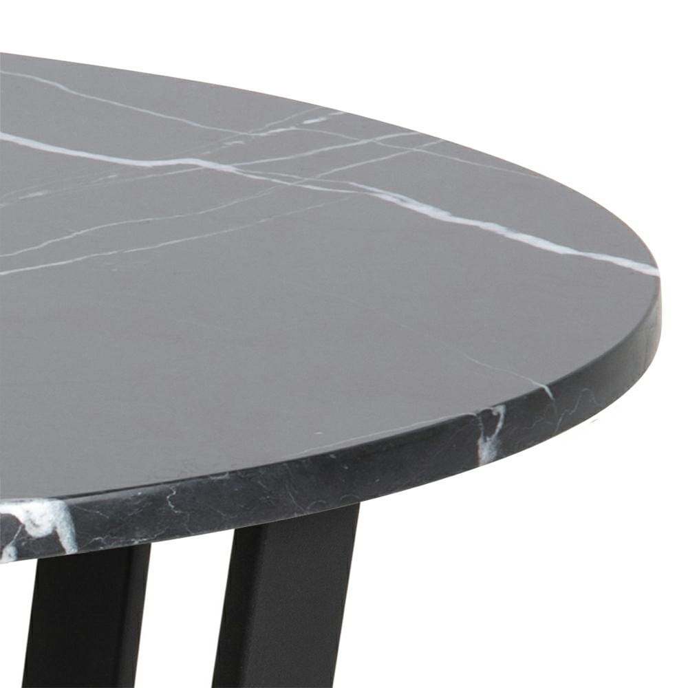 Stół Amble został wykonany z płyty MDF w okleinie imitującej marmur oraz z czarnej, metalowej malowanej proszkowo podstawy. Stół wpisuje się w styl industrialny, nowoczesny oraz modern classic. Okrągły blat stołu idealnie komponuje się z geometryczną podstawą. Nogi stołu przypominają zwężające się płozy, które krzyżują się pośrodku.