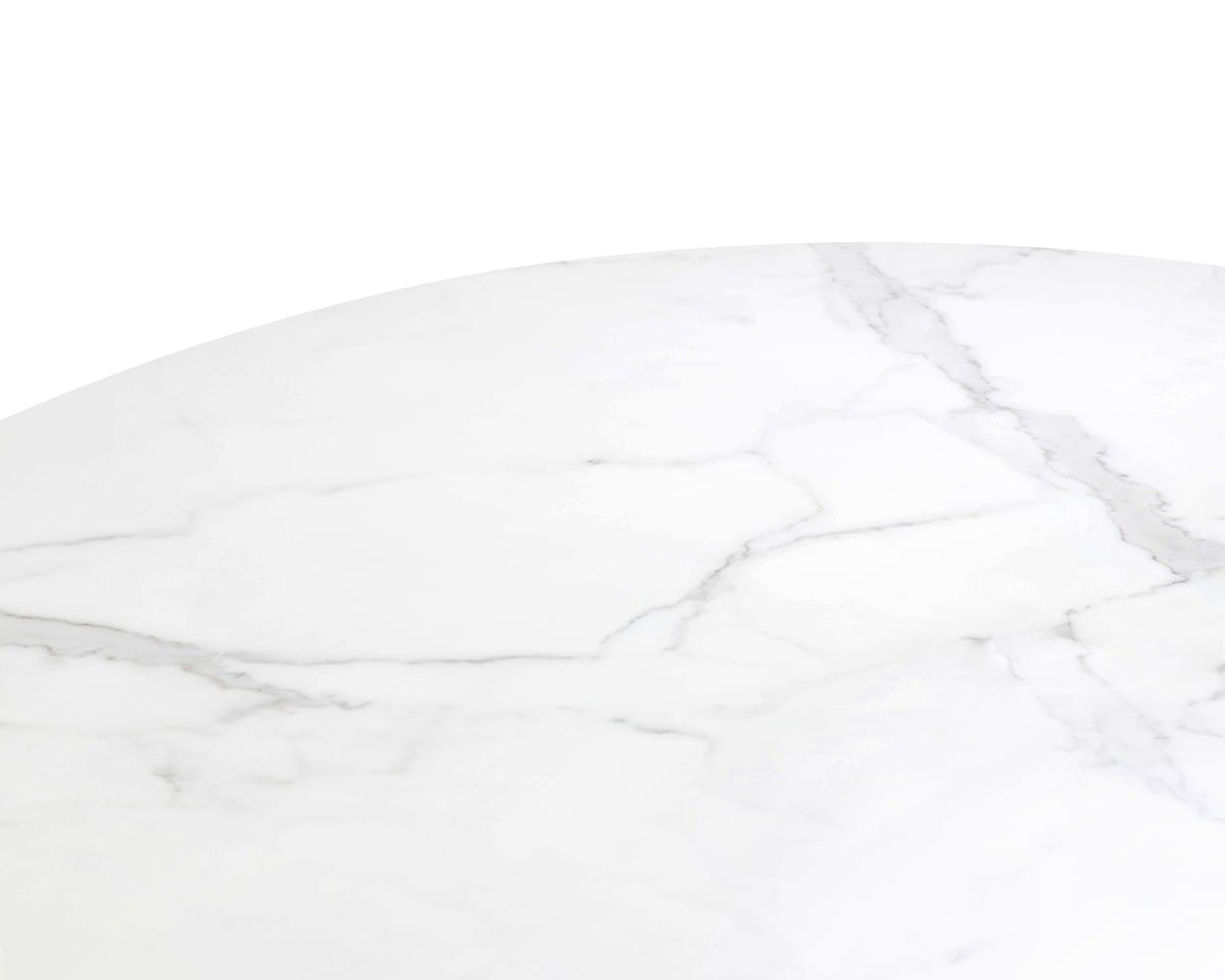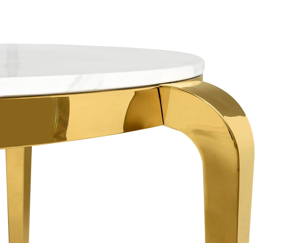 Odkryj wyjątkowy stół MAISON 130, który wzbudza zachwyt swoją nowoczesną formą i niezwykłym designem. Jego okrągły blat wykonany z konglomeratu imitującego marmur nadaje mu niepowtarzalny, luksusowy wygląd, podczas gdy podstawa ze stali, wykończona w bogatym złotym kolorze, dodaje mu elegancji i wyrafinowania.