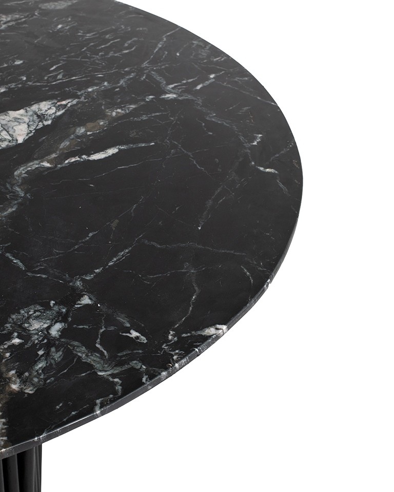 Blat wykonany z marmuru Black Marine urzeka głębokim, szlachetnym odcieniem czerni, ozdobionym naturalnym, jasnym żyłkowaniem. Kamień ten nie tylko przyciąga wzrok, ale również podkreśla ekskluzywny charakter mebla. Jego idealnie zaokrąglona forma dodaje wizualnej lekkości, jednocześnie nadając stołowi monumentalny wyraz.
