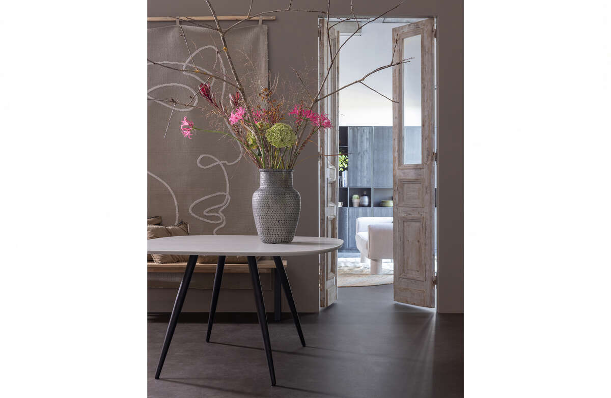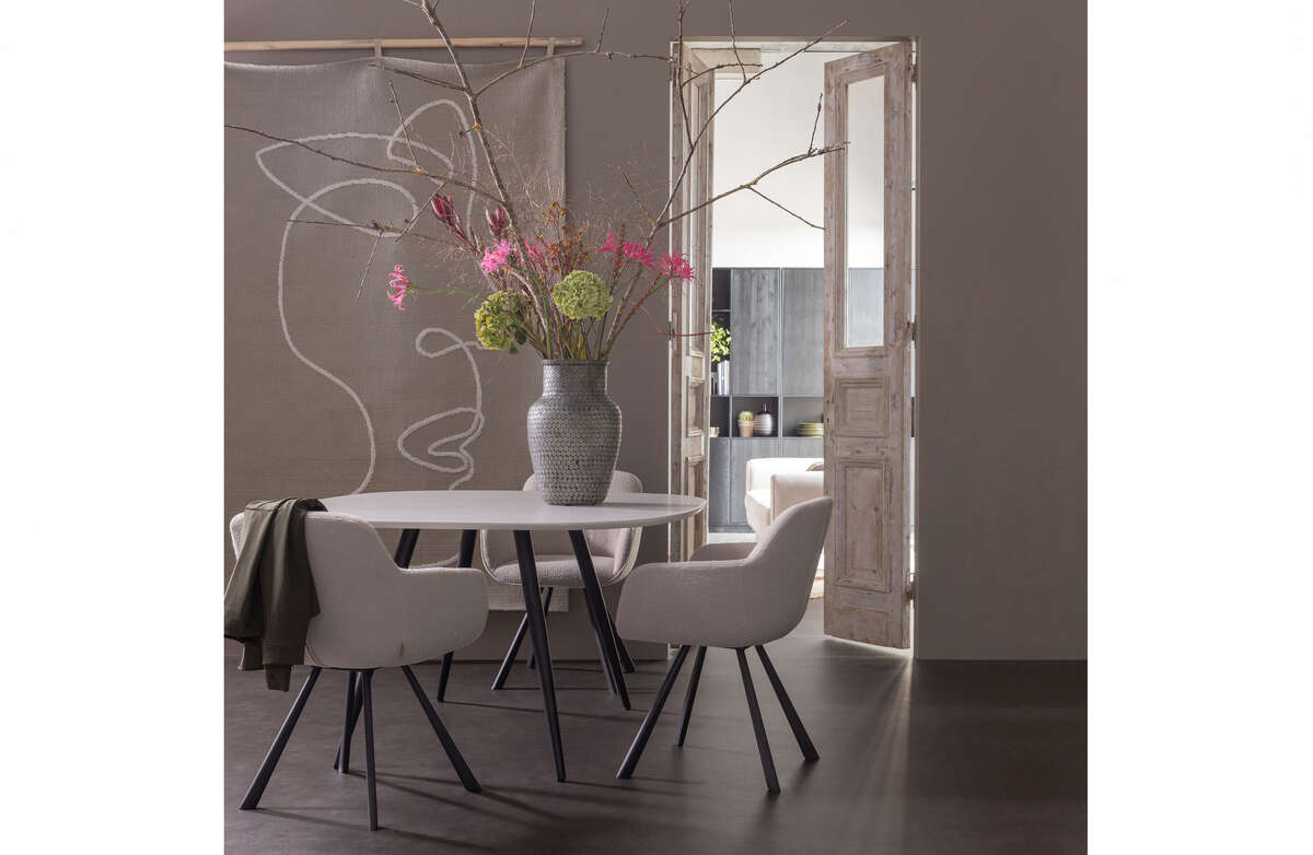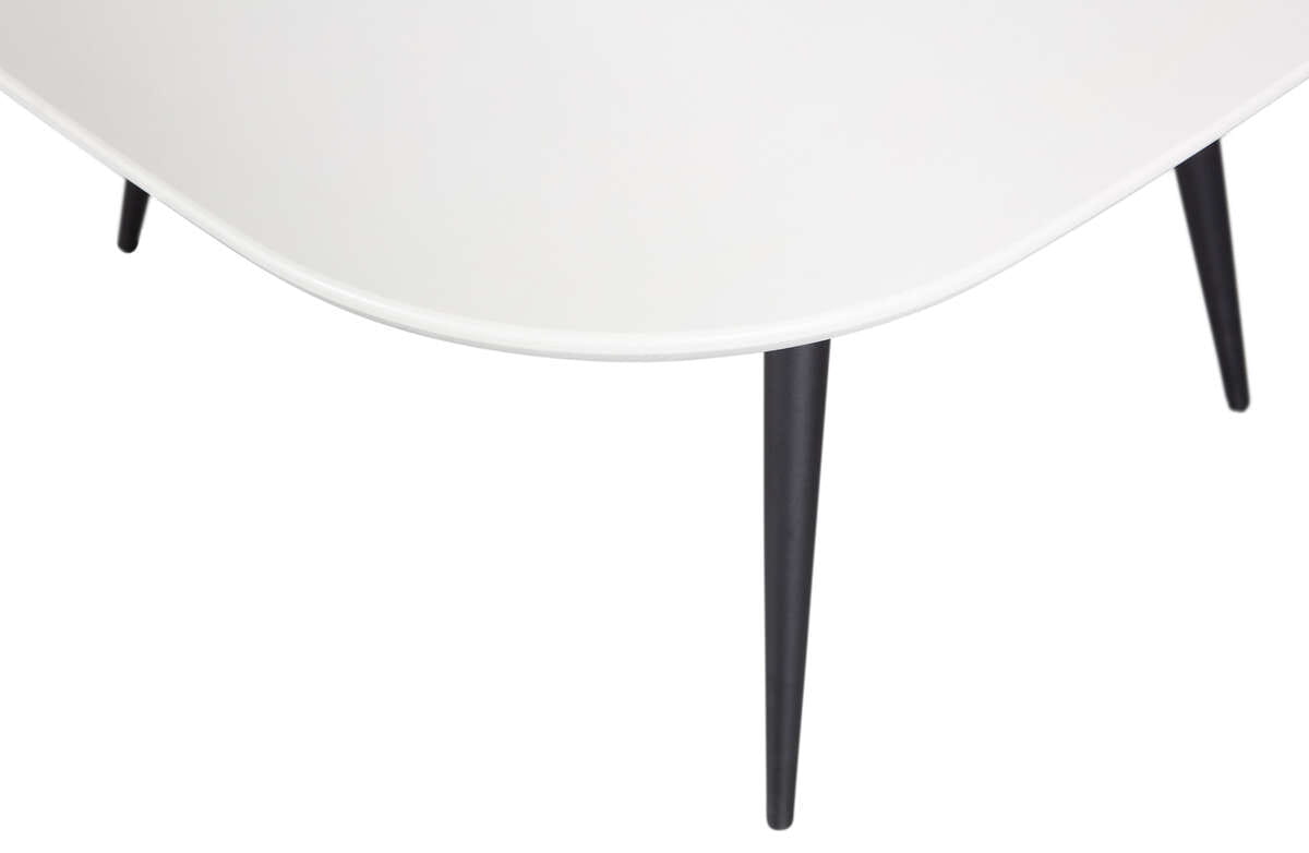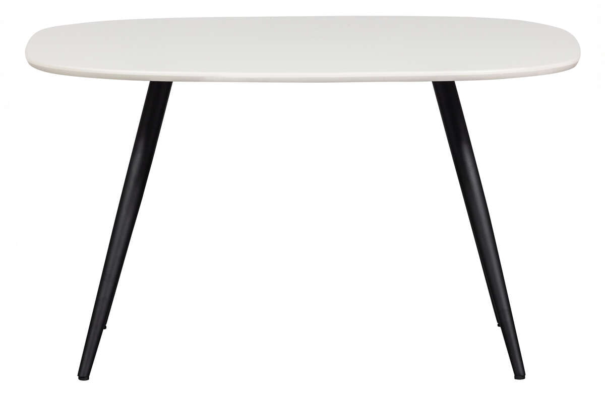 Organicznie ukształtowany blat stołu ma szerokość i długość 130 cm, ale nie można nazwać go ani okrągłym, ani kwadratowym. Wykonany został ze szlifowanego dębu z certyfikatem FSC, pomalowanego białym lakierem o matowym wykończeniu. Stół Tablo posiada delikatne, okrągłe nogi ze stalowej rurki malowanej proszkowo na czarno o średnicy od 5 cm na górze do ø 3 cm na dole.