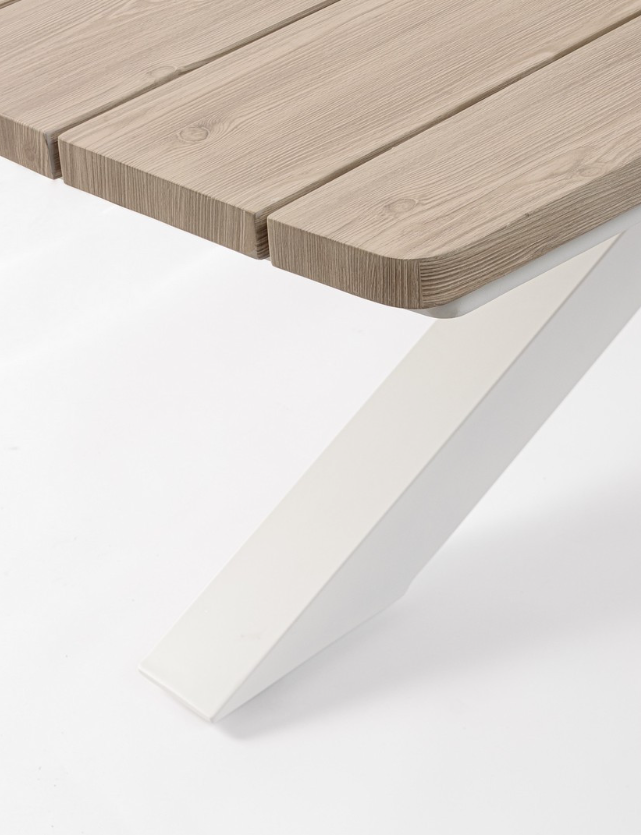 Główną atrakcją tego modelu jest jego zjawiskowy blat. Składa się on z niezwykle wytrzymałych lameli aluminiowych, które pokryto specjalną powłoką wiernie imitującą fakturę i usłojenie naturalnego drewna (Wood Effect). To rewolucyjne rozwiązanie pozwala cieszyć się przytulnym, organicznym wyglądem drewna, zachowując jednocześnie najwyższą trwałość metalu, który nie wymaga kłopotliwego olejowania ani sezonowej konserwacji. Stół został również wyposażony w regulowane stopki, co ułatwia jego wypoziomowanie na każdej nawierzchni.