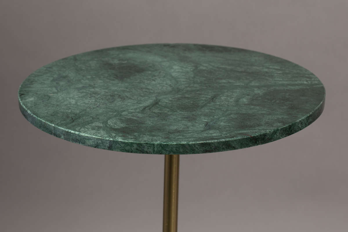 Blat i podstawa wykonane z drogocennego, zielonego marmuru sprawiają, że stolik nabiera unikatowego charakteru. Noga wykonana została z żelaza w złotym kolorze, które idealnie komponuje się z głębokim kolorem butelkowej zieleni. Marmurowe części mają grubość 14mm i poza funkcją estetyczną, są też niezwykle praktyczne i odporne na działanie czynników zewnętrznych.
