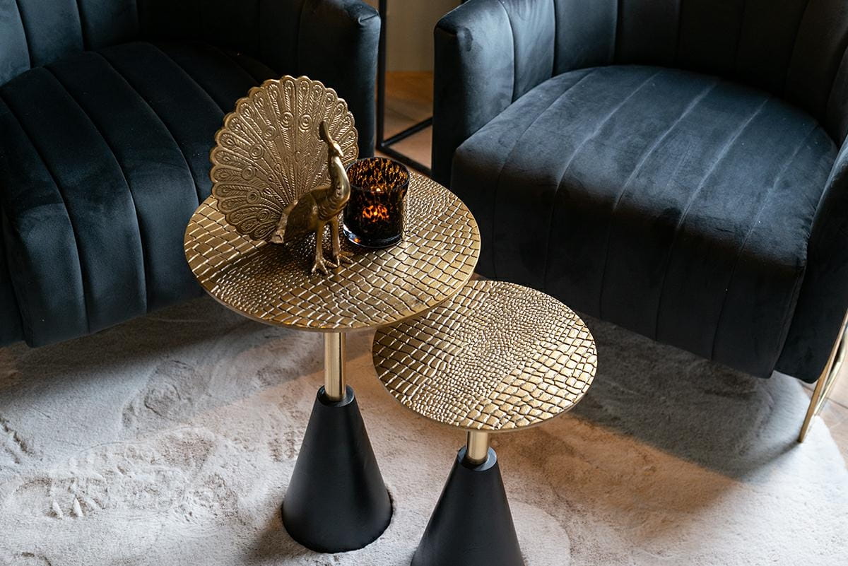 Dlaczego Cobra? Wystarczy spojrzeć na wzór wytłoczony na blacie, by przekonać się, skąd wzięła się nazwa tego wyjątkowego stolika. Imitująca fakturę skóry węża powierzchnia blatu musi robić i robi fenomenalne wrażenie. Dzięki temu zabiegowi dekoracyjnemu całość zyskuje drapieżny, wyrazisty charakter i wprowadza do wnętrz odrobinę nonszalancji oraz zmysłowości. Stolik Cobra został w całości wytworzony z aluminium. Złoty blat i czarna podstawa tworzą tandem idealny, pełen klasy i ponadczasowego stylu. Ta propozycja świetnie sprawdzi się w salonach nowoczesnych oraz takich inspirowanych egzotycznymi klimatami.