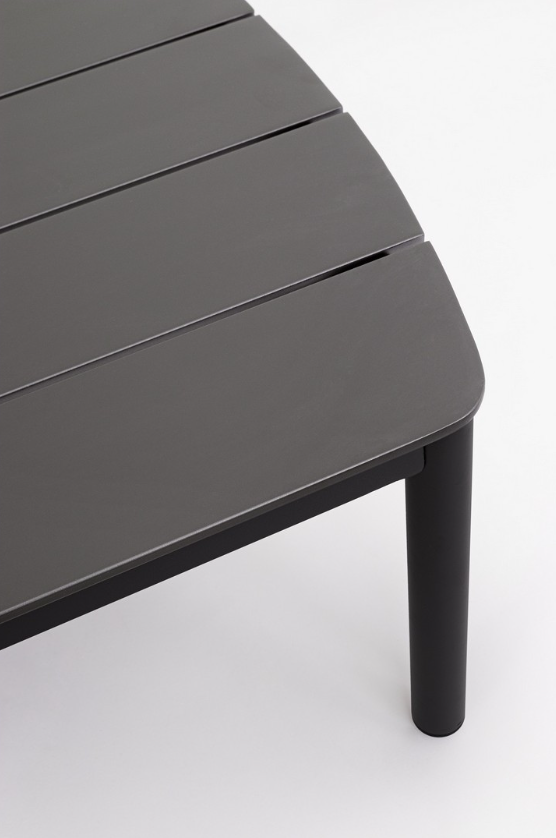 Szeroki na 115 cm blat charakteryzuje się subtelnie zaokrąglonymi rogami oraz konstrukcją z płaskich, aluminiowych paneli ułożonych ze spoinami zapobiegającymi zbieraniu się wody. Aby zagwarantować maksymalną wygodę codziennego użytkowania, w nogach stolika ukryto regulowane stopki. Pozwalają one na perfekcyjne wypoziomowanie mebla, dzięki czemu ustawisz go stabilnie nawet na nierównych płytkach czy starych deskach tarasowych.