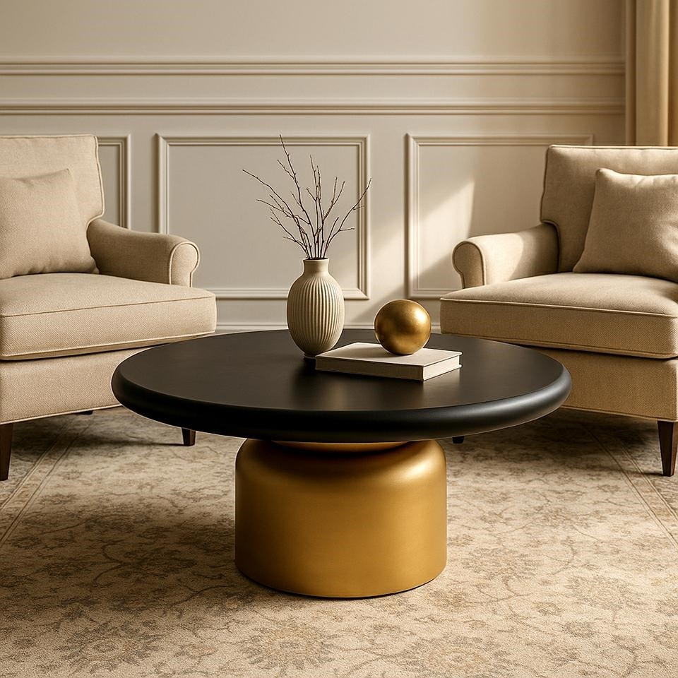Ich złota podstawa przyciąga wzrok delikatnym połyskiem, wprowadzając do wnętrza nutę glamour i wyrafinowania, a ciemny blat z zaokrągloną krawędzią równoważy całość, nadając projektowi głębi oraz eleganckiego minimalizmu. Oba stoliki — niższy i szerszy model kawowy oraz wyższy wariant pomocniczy — doskonale prezentują się zarówno samodzielnie, jak i zestawione razem, tworząc spójną, luksusową kompozycję.