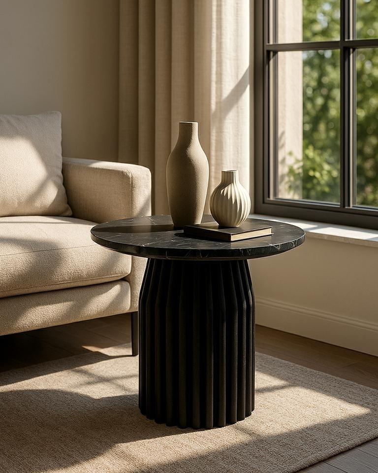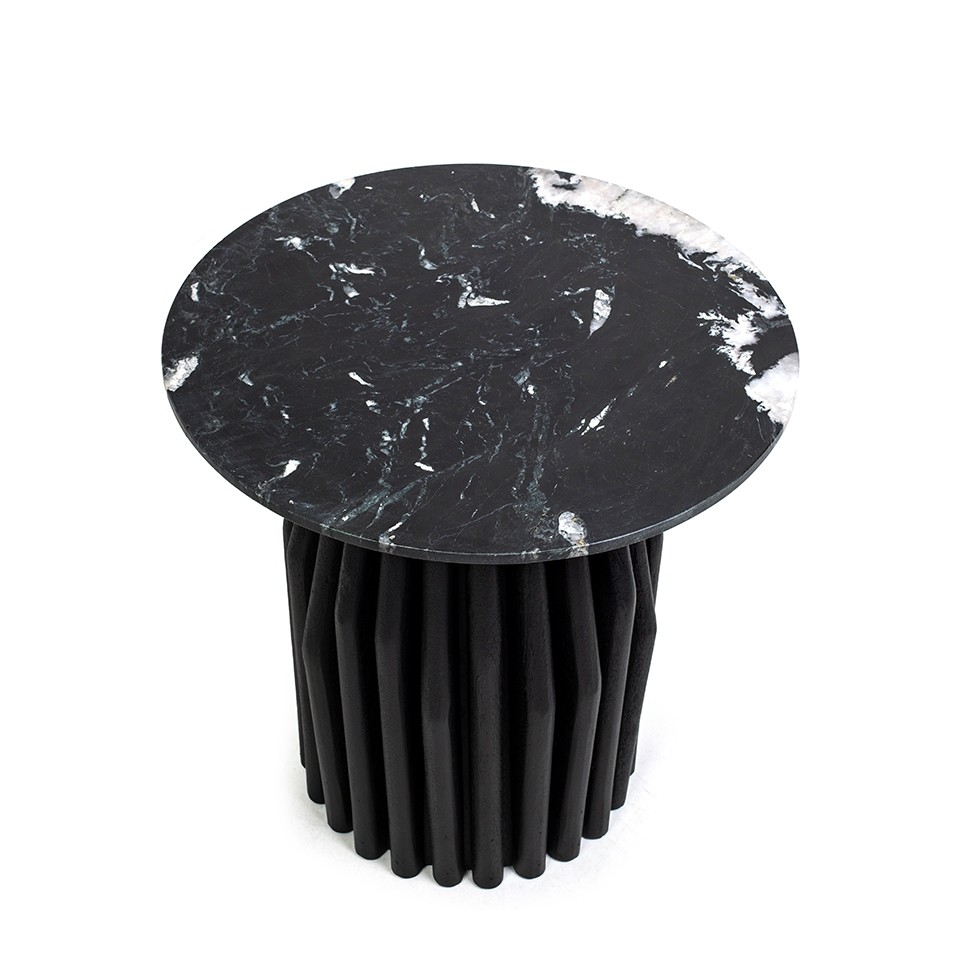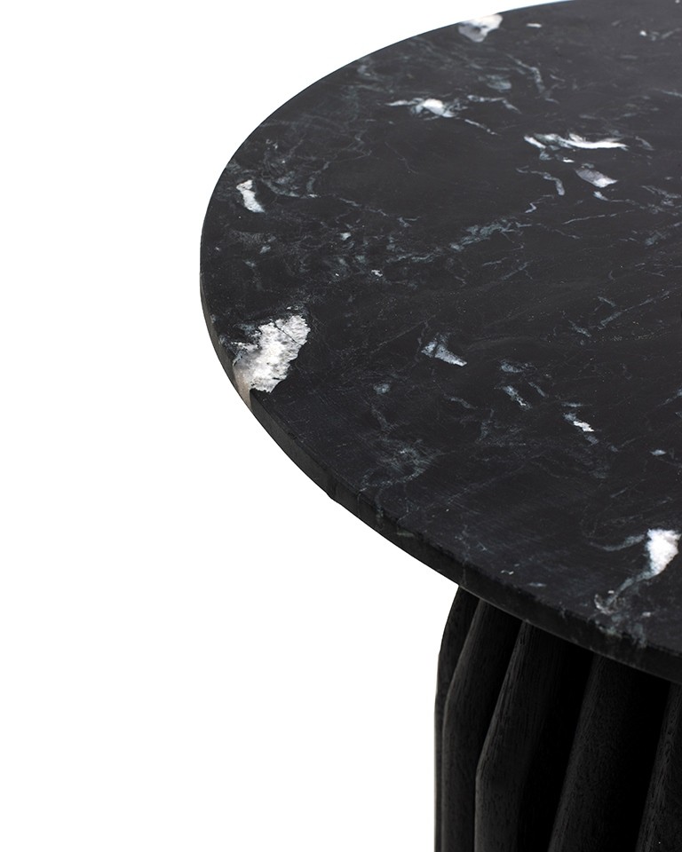 Solidna podstawa wykonana z egzotycznego drewna mango przyciąga uwagę dynamiczną, rzeźbiarską formą. Jej wyraźne ryflowanie nadaje całości architektoniczny wyraz i lekko industrialny sznyt, zachowując jednocześnie ciepło naturalnego surowca. W kontraście do niej osadzony został idealnie okrągły blat z marmuru Black Marine – ciemnego kamienia z charakterystycznym, białym użyleniem, który wnosi nutę wyrafinowanego luksusu.
