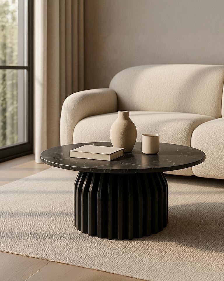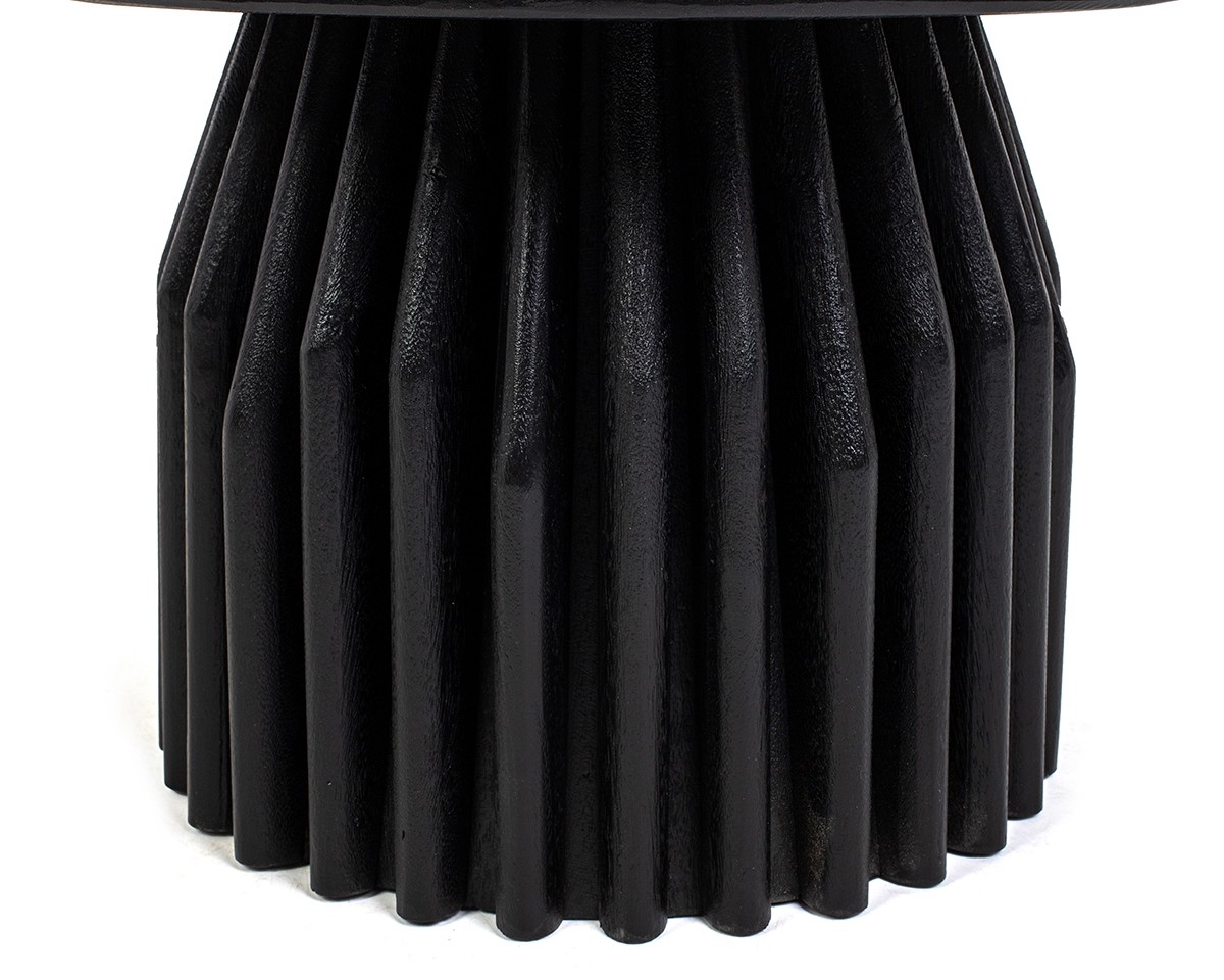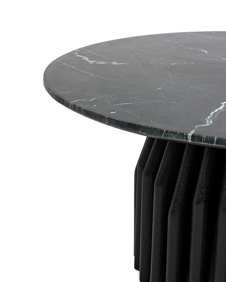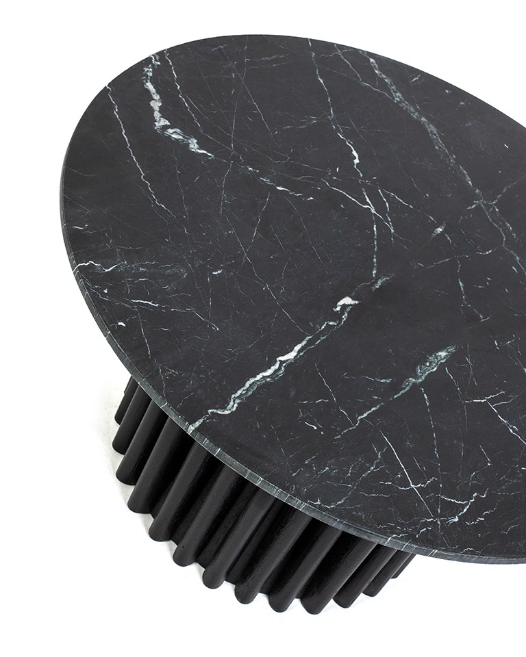 Solidna podstawa wykonana z egzotycznego drewna mango przyciąga uwagę dynamiczną, rzeźbiarską formą. Jej wyraźne ryflowanie nadaje całości architektoniczny wyraz i lekko industrialny sznyt, zachowując jednocześnie ciepło naturalnego surowca. W kontraście do niej osadzony został idealnie okrągły blat z marmuru Black Marine – ciemnego kamienia z charakterystycznym, białym użyleniem, który wnosi nutę wyrafinowanego luksusu.
