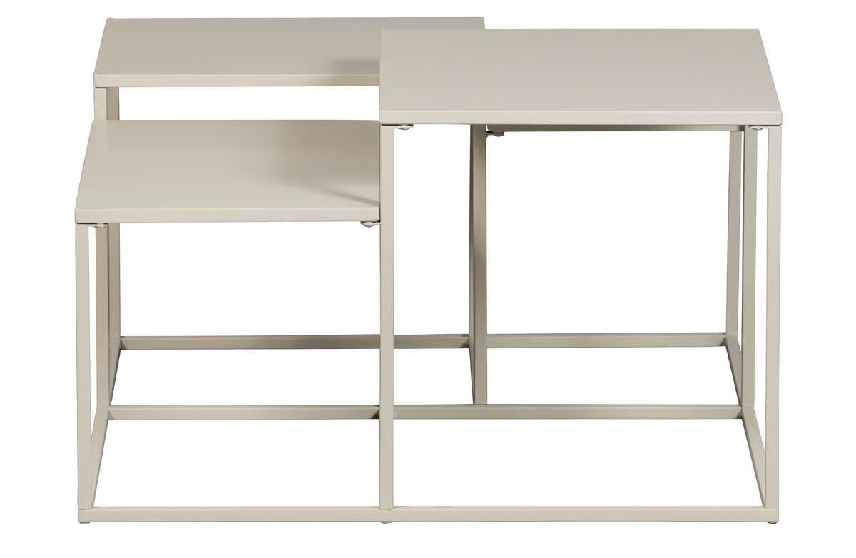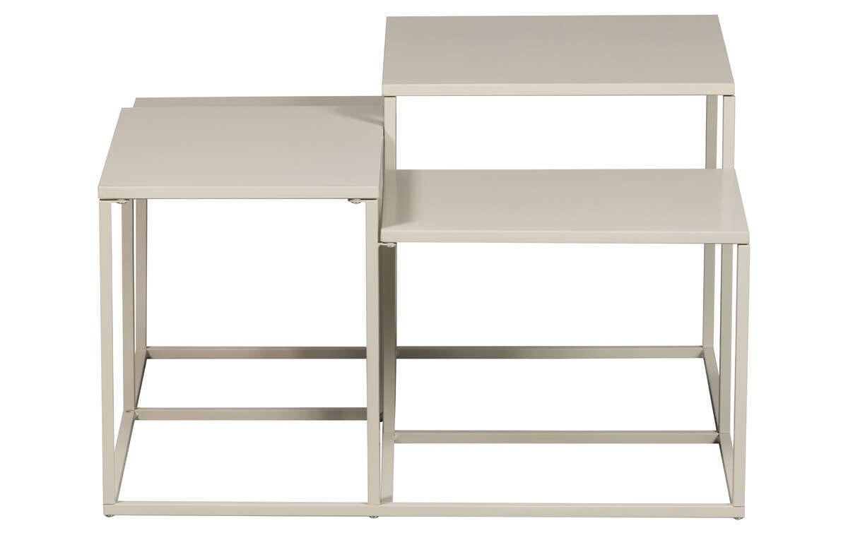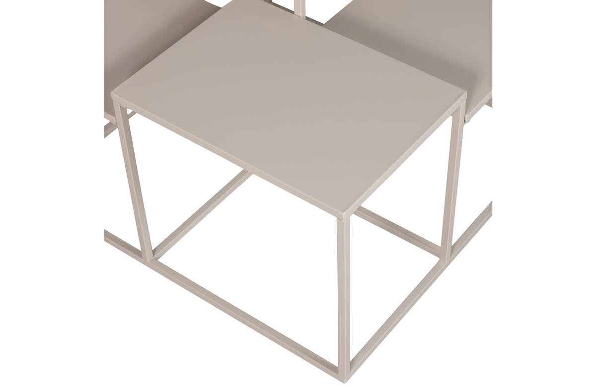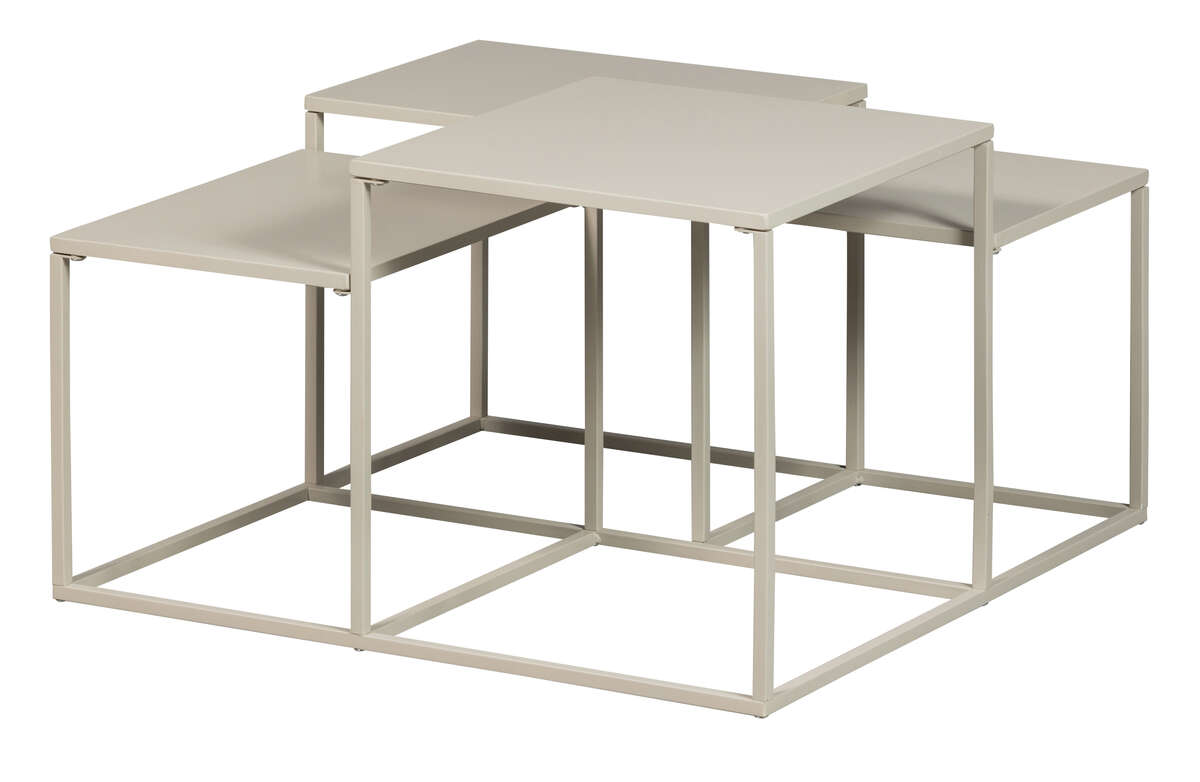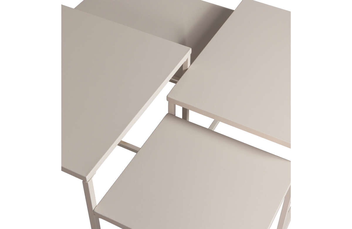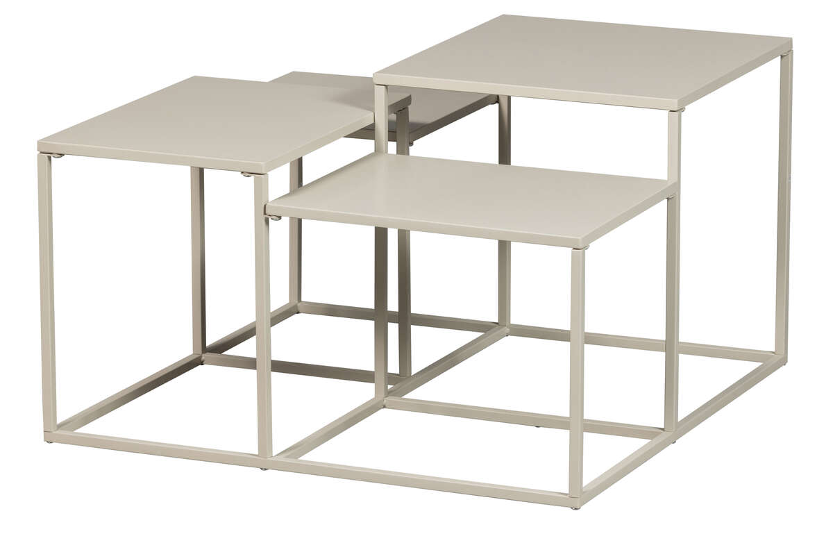 Jego barwa to harmonijne połączenie szarości i beżu, czyli kolor greige, który z łatwością dostosowuje się do szerokiej palety barw. Stolik ma kwadratową konstrukcję w industrialnym stylu, na której osadzone zostały 4 blaty w różnych rozmiarach – S, M, L i XL. Zróżnicowana wielkość, jak również osadzenie blatów na różnych wysokościach tworzą abstrakcyjną formę, która będzie dynamicznym i wyrazistym elementem wystroju.