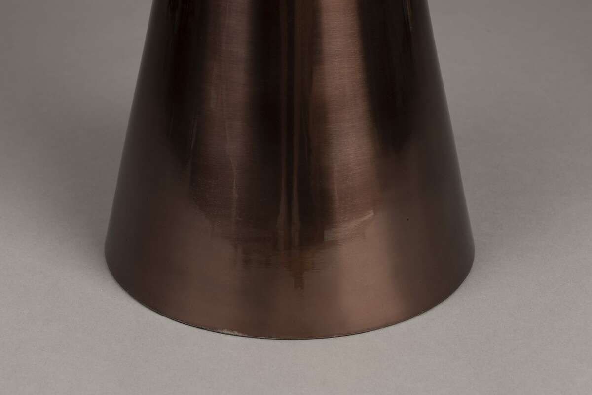 Stolik Mount powstał z odlewu aluminium, tworząc niebanalny, geometryczny kształt, w którym podstawa w kształcie stożka płynnie łączy się z rozchylającym się ku górze blatem. Powierzchnię blatu wykończono brązowym marmurem, z charakterystycznym dla tego kamienia wzorem użylenia. Marmur jest jednym z najbardziej ekskluzywnych i szlachetnych materiałów, perfekcyjnie prezentującym się w praktycznie każdym wnętrzu