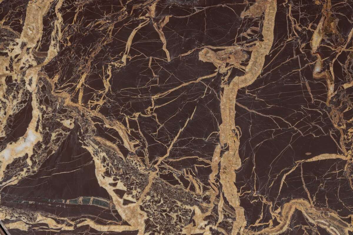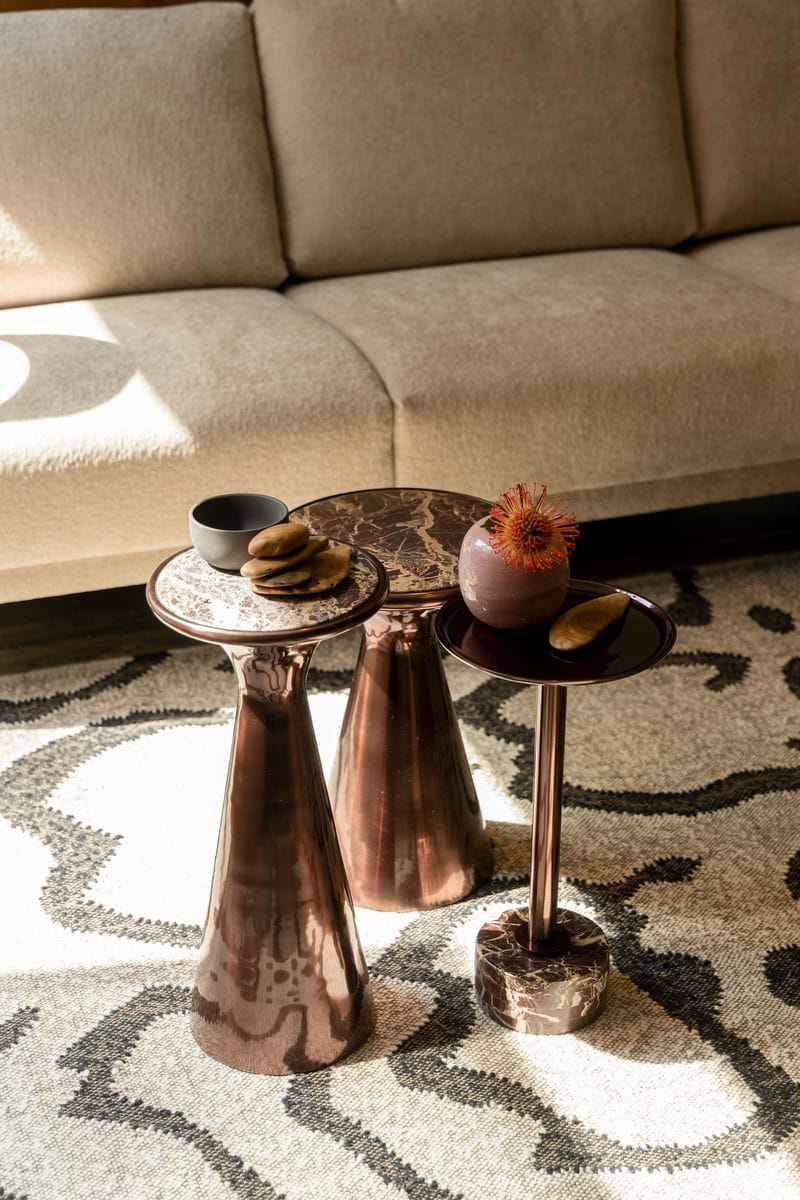 Stolik Mount powstał z odlewu aluminium, tworząc niebanalny, geometryczny kształt, w którym podstawa w kształcie stożka płynnie łączy się z rozchylającym się ku górze blatem. Powierzchnię blatu wykończono brązowym marmurem, z charakterystycznym dla tego kamienia wzorem użylenia. Marmur jest jednym z najbardziej ekskluzywnych i szlachetnych materiałów, perfekcyjnie prezentującym się w praktycznie każdym wnętrzu
