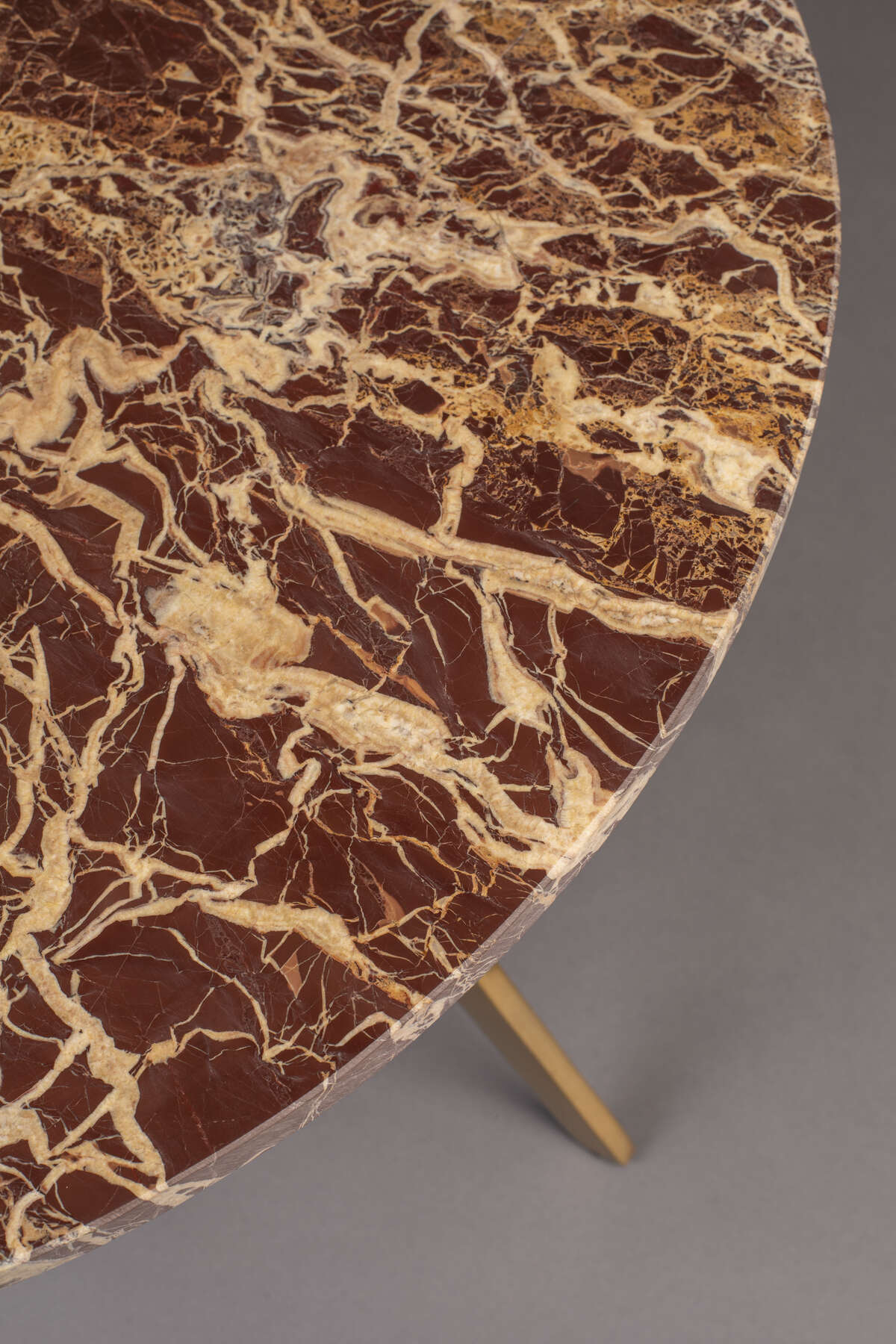 Praktyczny i jednocześnie elegancki stolik kawowy to niezbędny element uzupełniający przestrzeń każdego salonu, biura, gabinetu czy poczekalni. Okrągły stolik kawowy w pięknym i ciekawym połączeniu czerwonego marmuru i wyjątkowych nóżek w kolorze złotym, wniesie do Twojego wnętrza prawdziwy powiew elegancji! Stolik dzięki swym kompaktowym rozmiarom, doskonale sprawdzi się w różnych pomieszczeniach jako stolik kawowy do codziennego użytku lub stolik boczny.